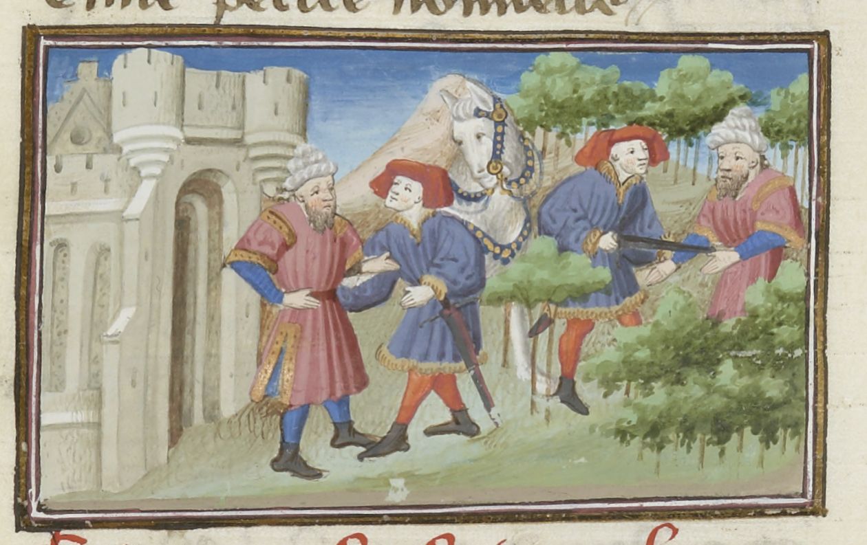 Parigi, Bibliothèque Nationale de France, Fr. 239, f. 270v. Mitridanes incontra Natan; nel bosco, Mitridanes tenta di uccidere Natan, il quale rinuncia a difendersi.