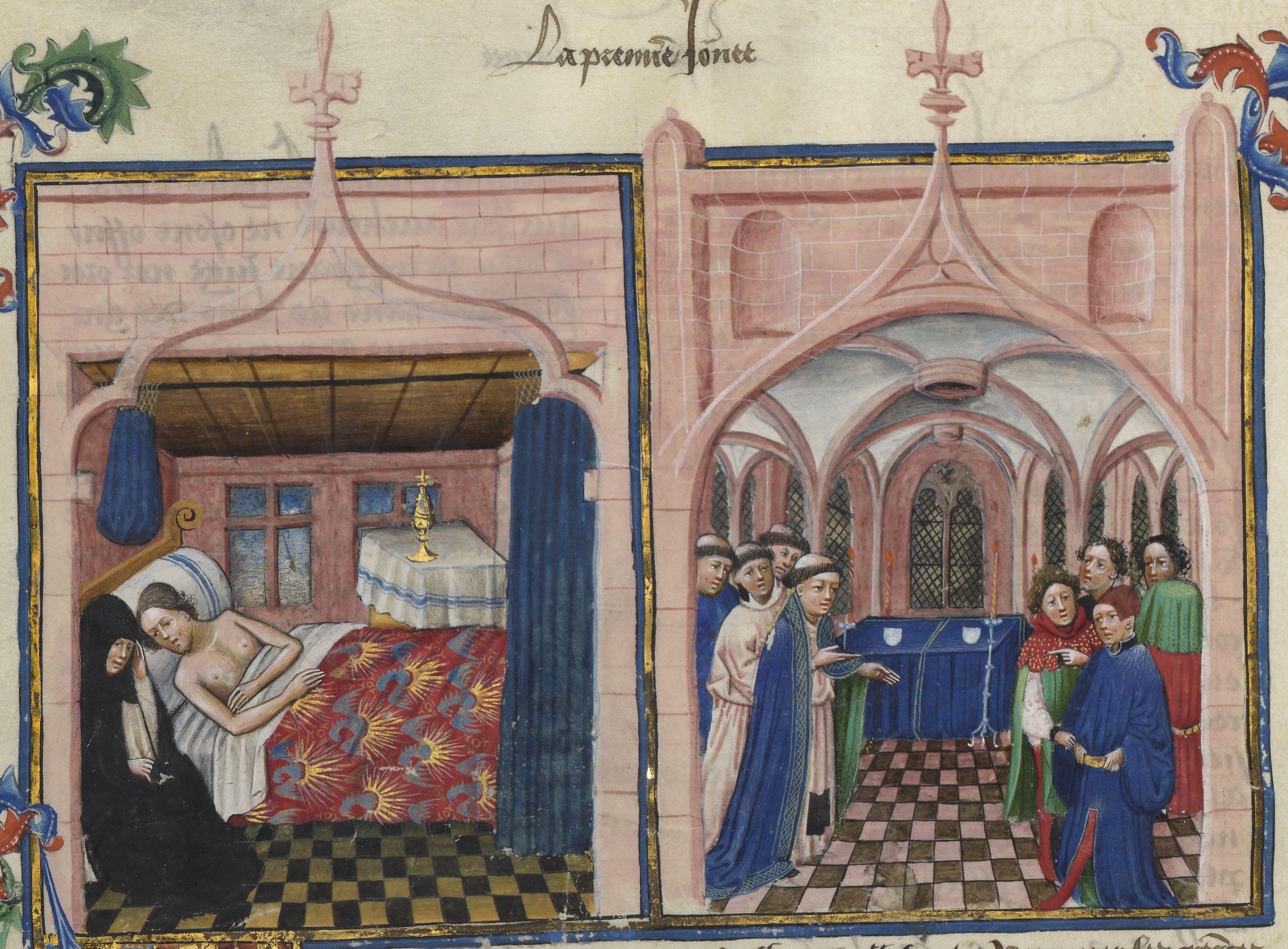 Parigi, Bibliothèque de l'Arsenal, 5070, f. 12v. Il copista del manoscritto è Guillebert de Mets. Un prete ascolta la confessione di Ser Ciappelletto in punto di morte; in chiesa i fedeli ascoltano un'orazione in cui si esaltano le virtù del defunto.
