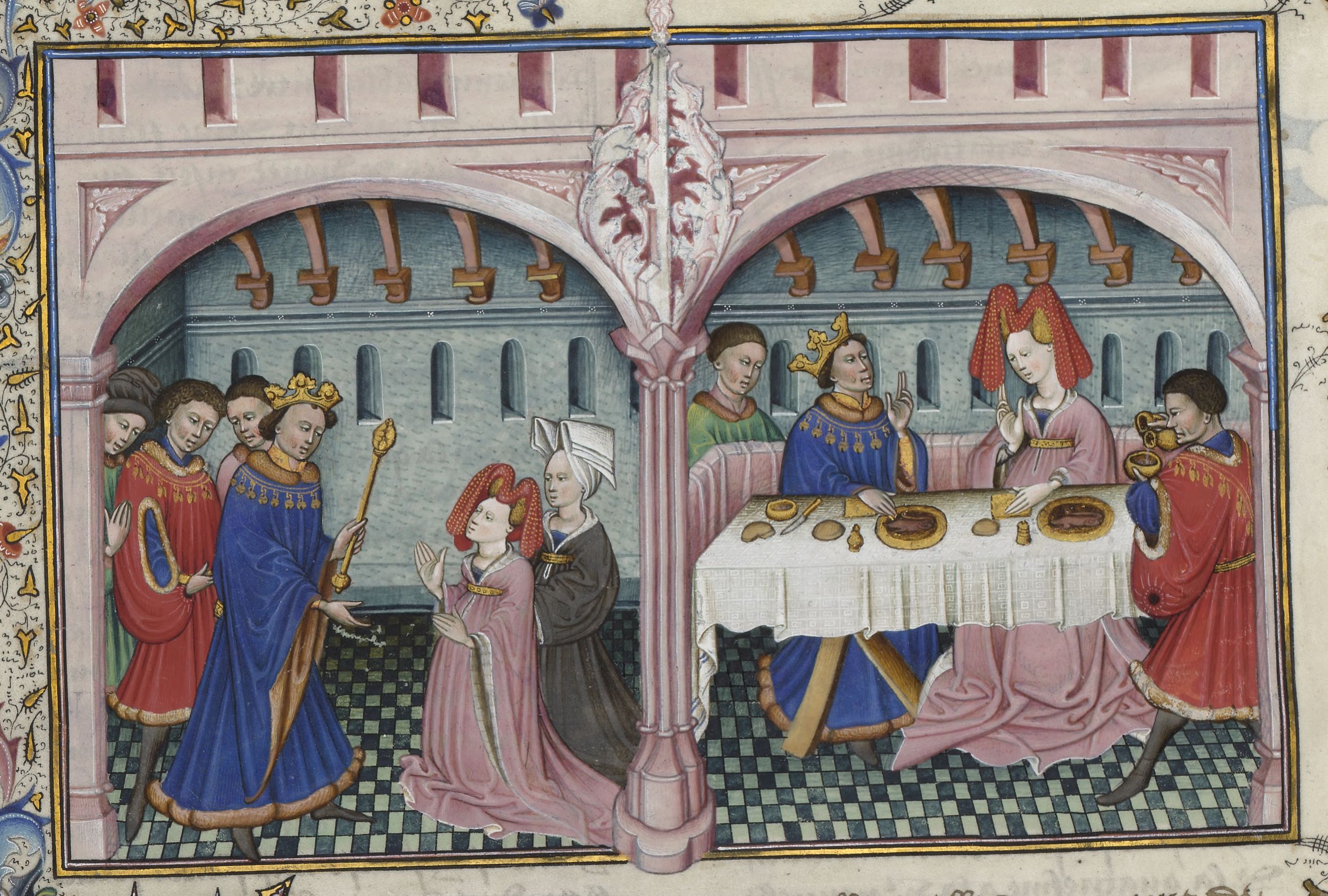 Parigi, Bibliothèque de l'Arsenal, 5070, f. 25v. Il copista del manoscritto è Guillebert de Mets. La marchesa del Monferrato accoglie nella sua dimora il re Filippo il Bornio ed il suo seguito; la marchesa offre al re un banchetto a base di galline.