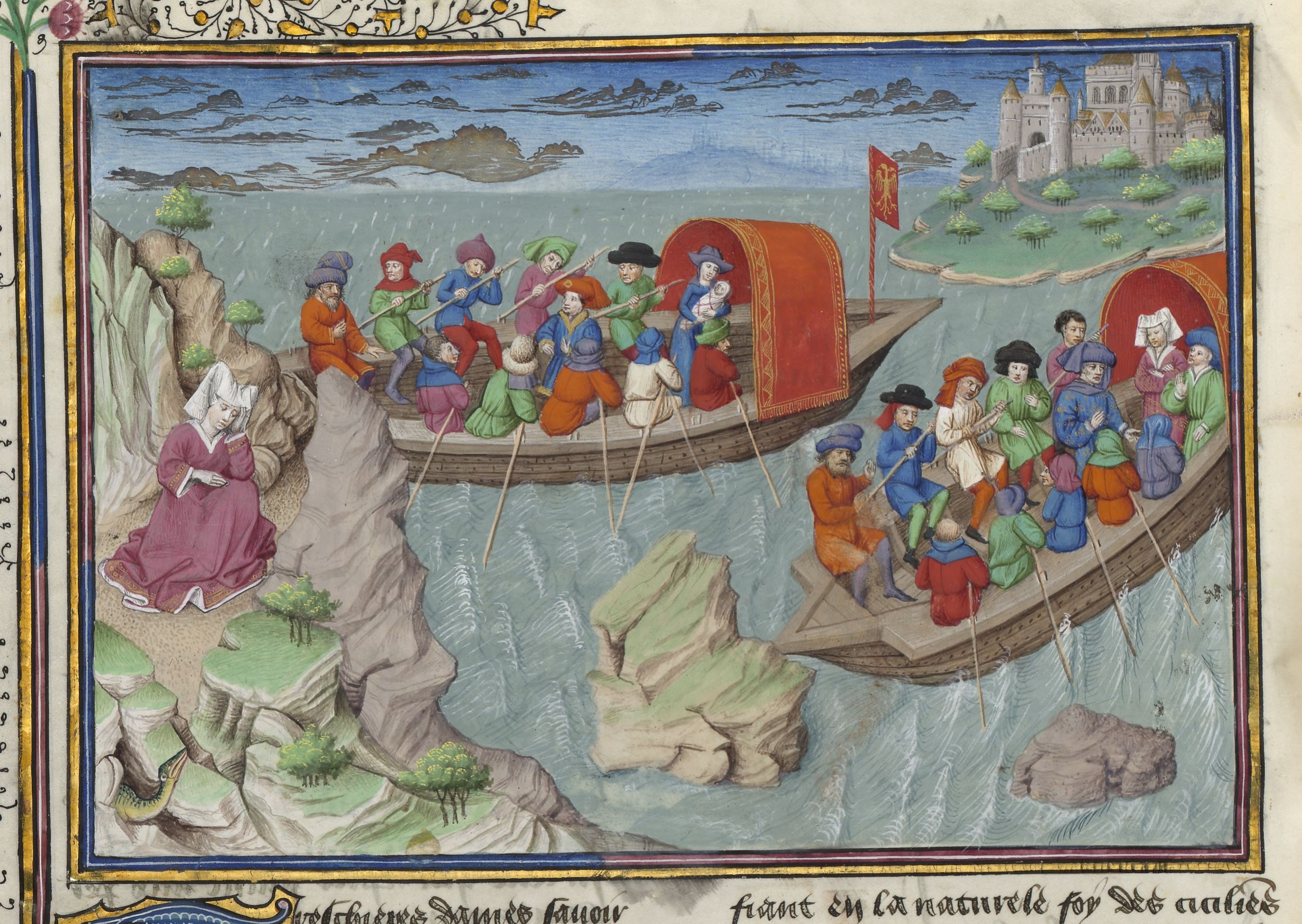 Maestro di Jean Mansel (1430-1450), Beritola abbandonata sulle rocce di Ponza; due imbarcazioni solcano le acque