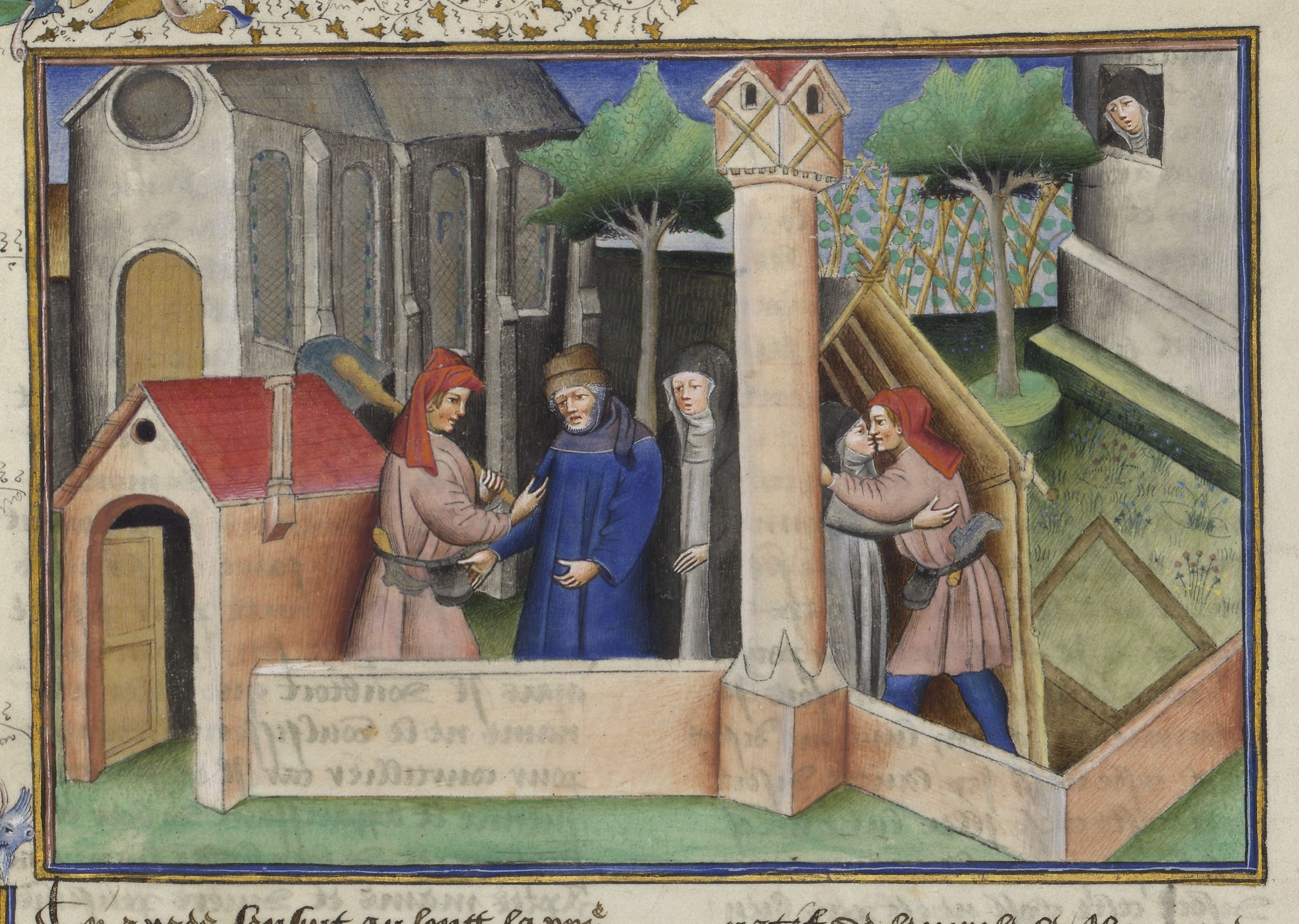 Parigi, Bibliothèque de l'Arsenal, 5070, f. 97r. Il copista del manoscritto è Guillebert de Mets. Fingendosi sordomuto, Masetto chiede al castaldo di poter entrare nel convento delle monache; Masetto e una monaca si baciano di nascosto in una capanna.
