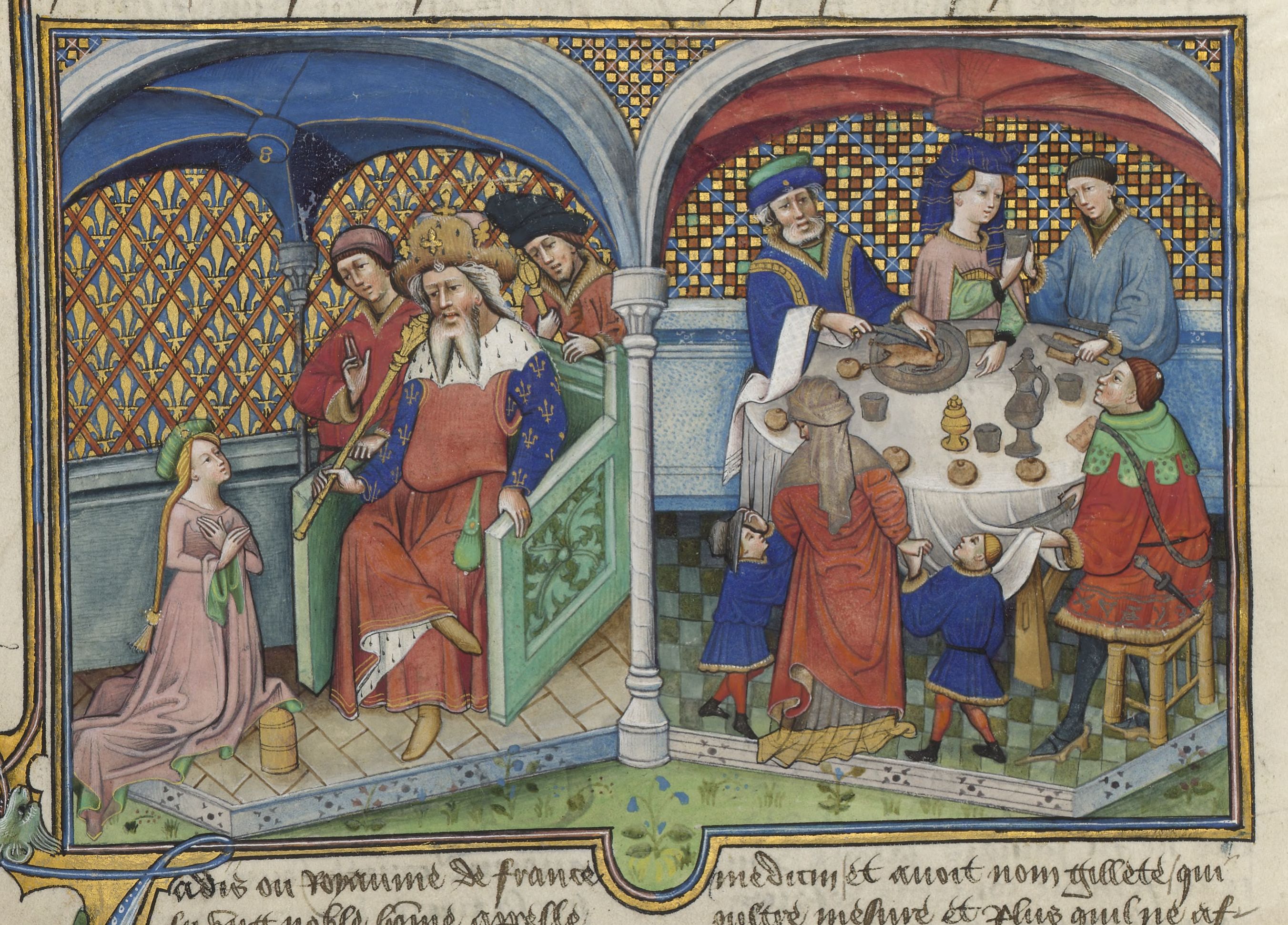 Parigi, Bibliothèque de l'Arsenal, 5070, f. 132v. Il copista del manoscritto è Guillebert de Mets. Giletta, in cambio di una cura per il re, chiede in sposo Beltramo di Rossiglione; ad un banchetto Giletta presenta a Beltramo i suoi due figli.
