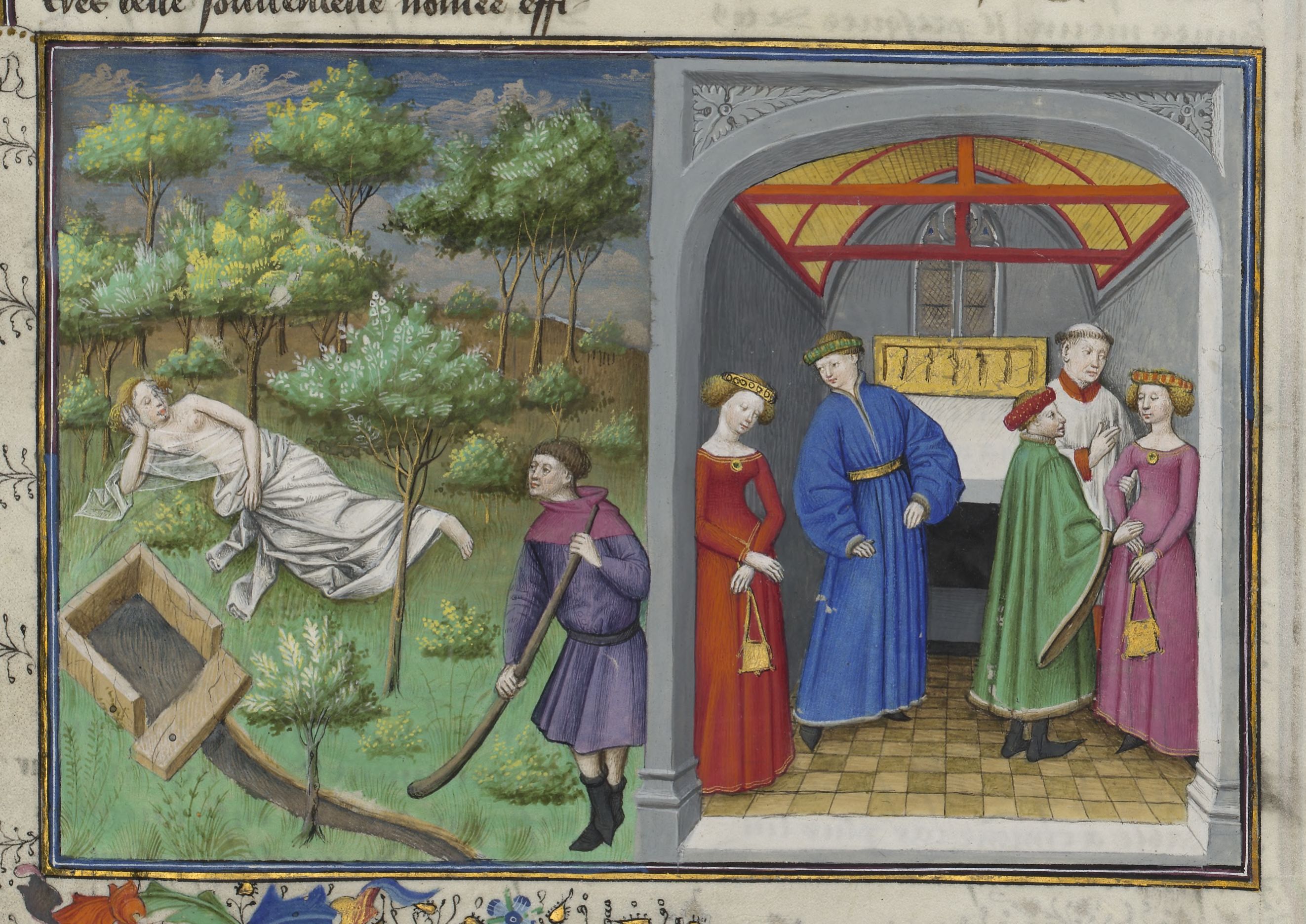 Maestro di Jean Mansel (1430-1450), Cimone osserva Efigenia addormentata; si celebra un doppio matrimonio