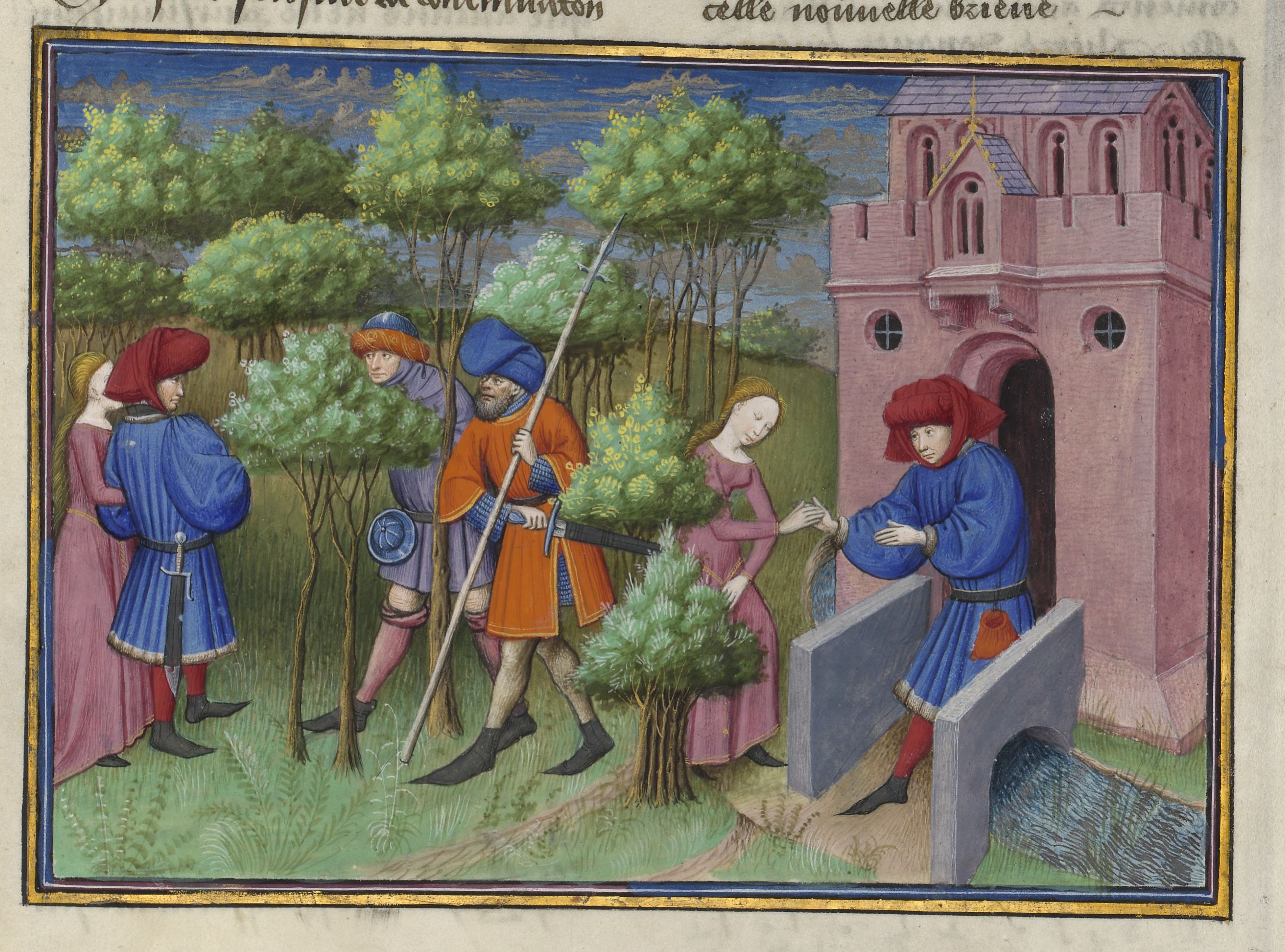 Parigi, Bibliothèque de l'Arsenal, 5070, f. 191r. Il copista del manoscritto è Guillebert de Mets. Pietro Boccamazza e l'Agnolella vengono aggrediti nel bosco da due briganti; la coppia si ricongiunge presso il castello dell'Orsini.