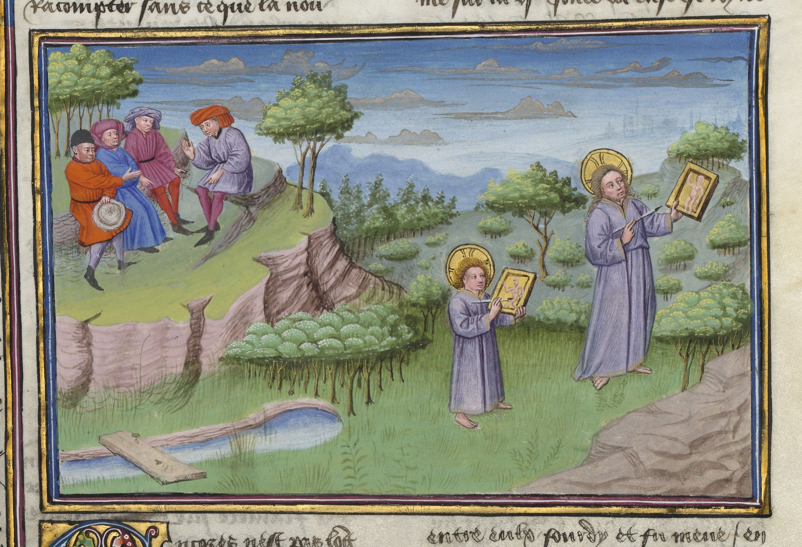 Parigi, Bibliothèque de l'Arsenal, 5070, f. 229v. Il copista del manoscritto è Guillebert de Mets. Michele Scalza discute con i suoi amici sulla collina di Montughi; Dio bambino impara a disegnare; Dio adulto mostra un disegno compiuto.