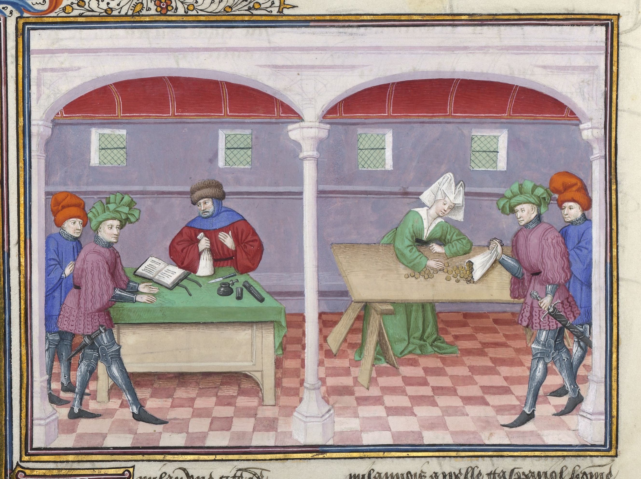 Maestro di Jean Mansel (1430-1450), Guasparruolo presta del denaro a Gulfardo; Gulfardo consegna i soldi ad Ambrogia