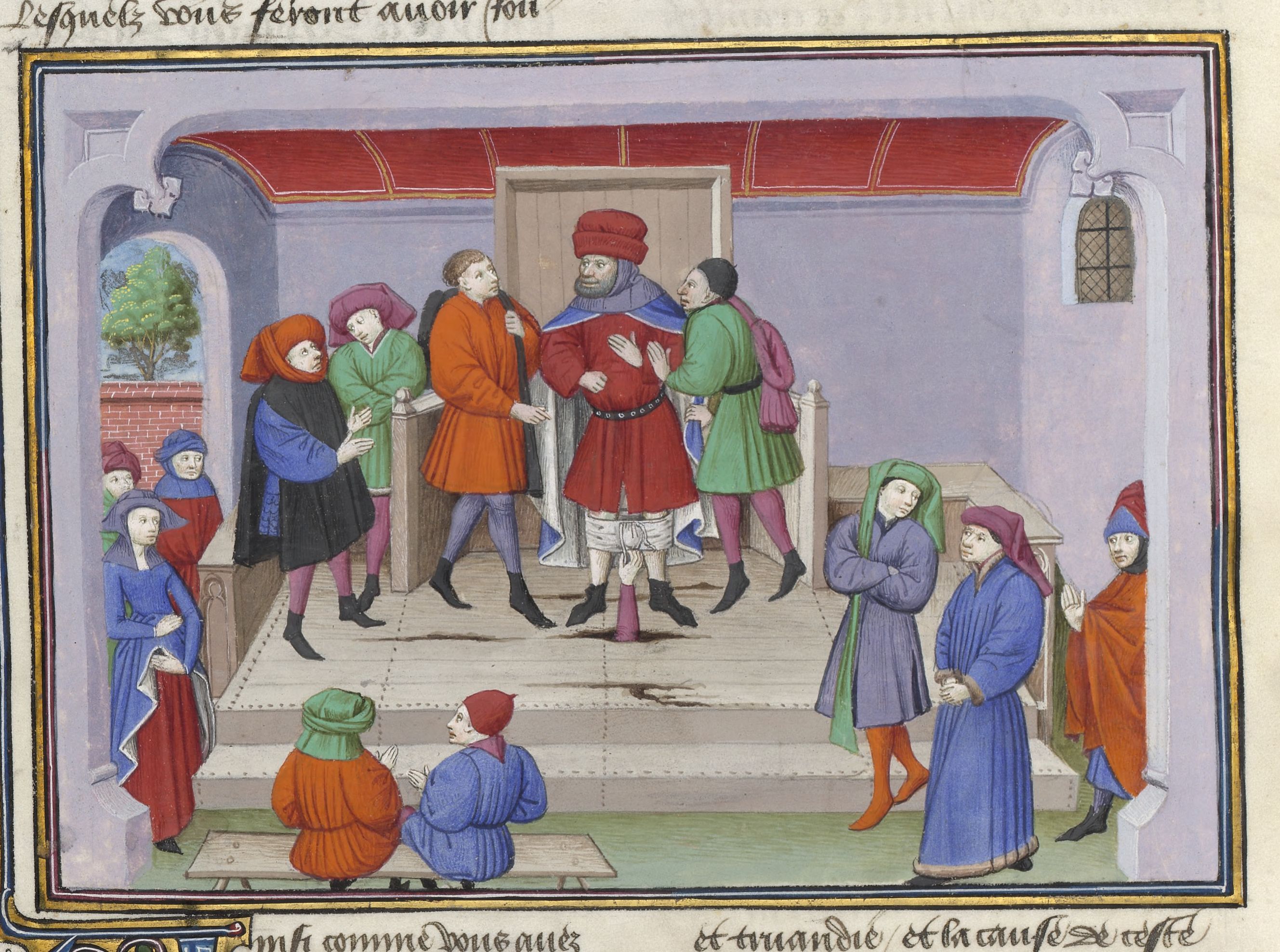 Parigi, Bibliothèque de l'Arsenal, 5070, f. 287v. Il copista del manoscritto è Guillebert de Mets. Matteuzzo tira giù le braghe al giudice Nicola mentre questi dirime una finta contesa tra Ribi e Maso del Saggio.