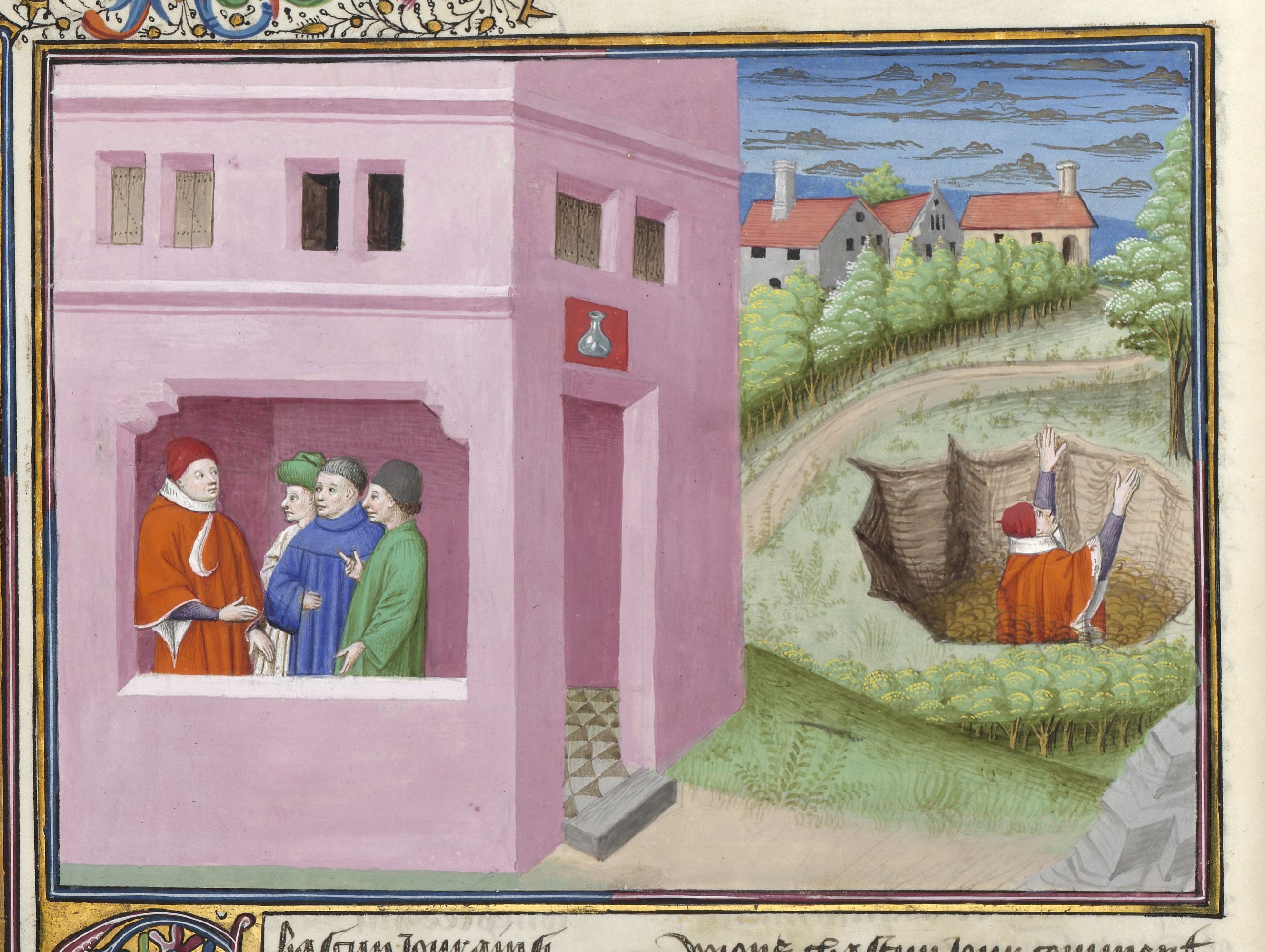 Maestro di Jean Mansel (1430-1450), Simone da Villa parla con Bruno e Buffalmacco; il maestro cade in una fossa fetida