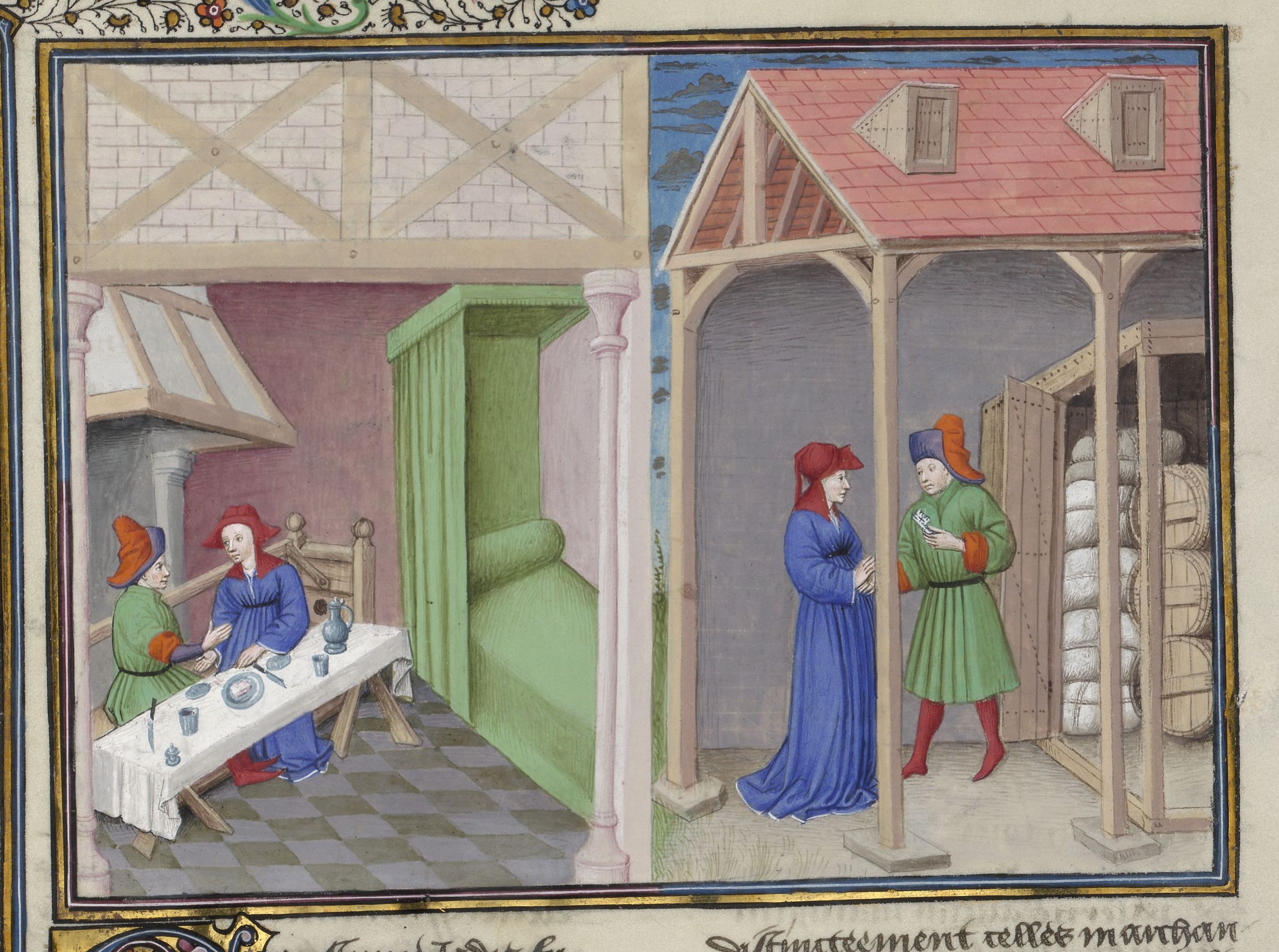 Maestro di Jean Mansel (1430-1450), Salabaetto siede a tavola con Iancofiore; Salabaetto si fa consegnare la chiave del magazzino