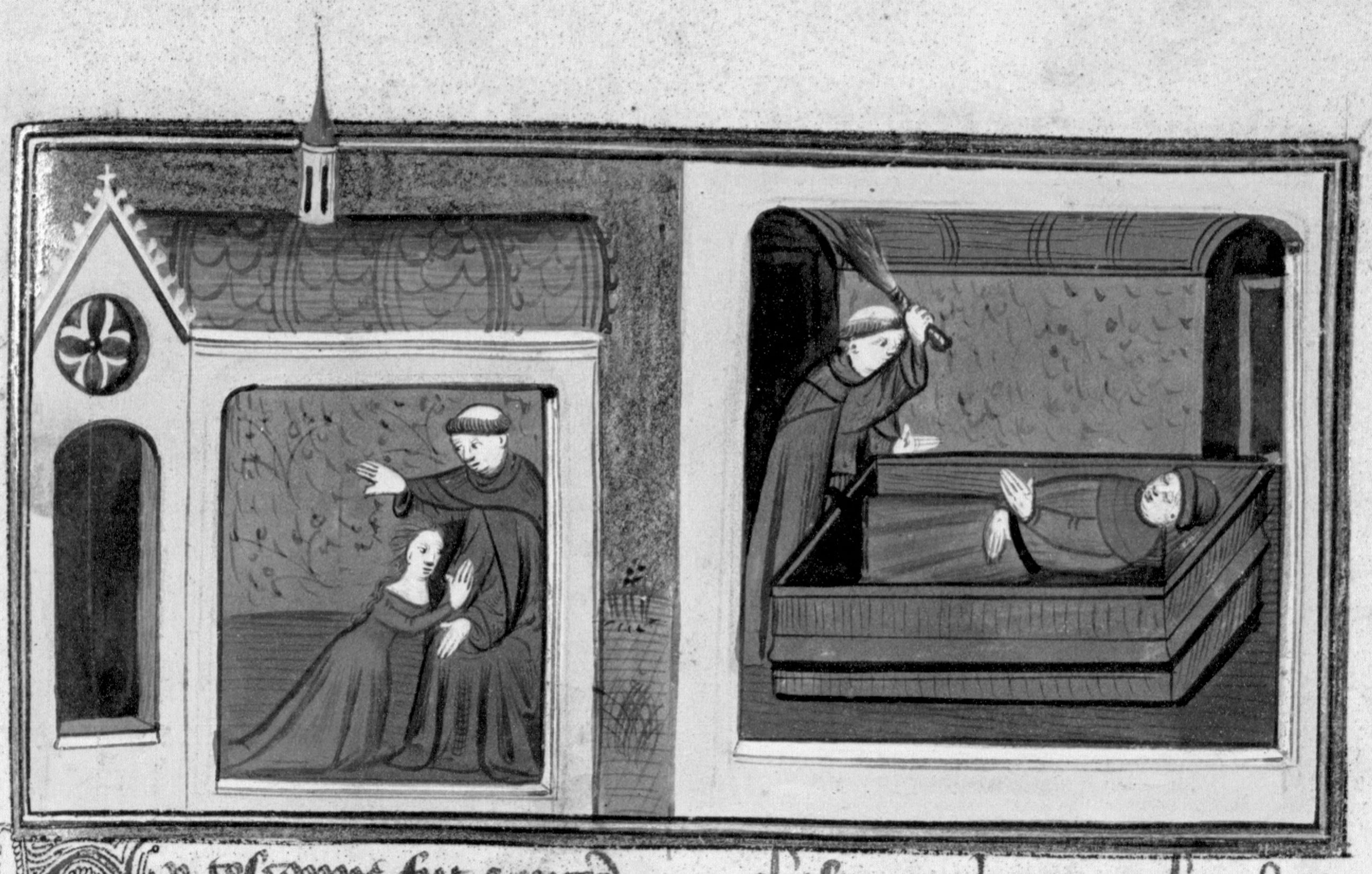 Parigi, Bibliothèque Nationale de France, Fr. 12421, f. 148r. La moglie di Ferondo si confessa in chiesa con l'abate; l'abate usa un randello per fustigare Ferondo, facendogli credere di essere in Purgatorio.