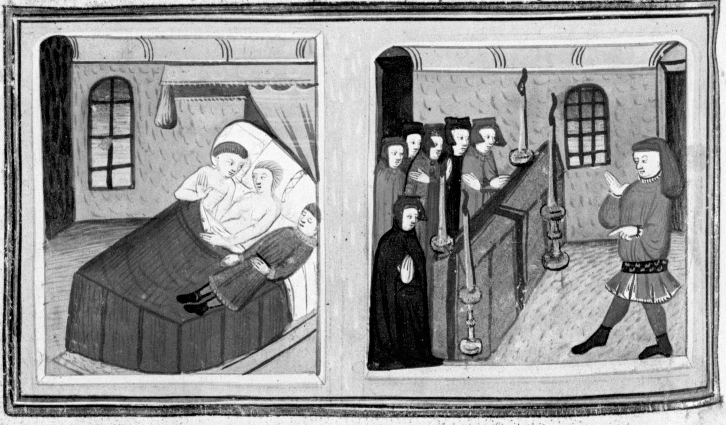 Parigi, Bibliothèque Nationale de France, Fr. 12421, f. 197v. Girolamo muore disteso sul letto accanto a Salvestra e a suo marito; Salvestra partecipa al funerale del giovane insieme ad altre donne, mentre sopraggiunge un uomo.