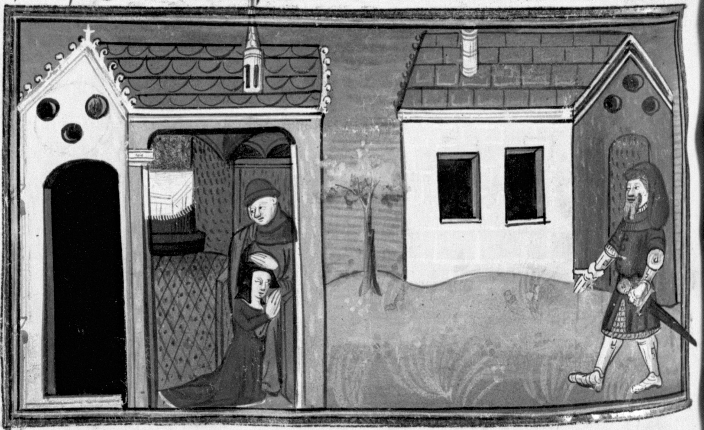 Parigi, Bibliothèque Nationale de France, Fr. 12421, f. 294v. Arimino, travestito da prete, ascolta la confessione della moglie; di notte l'uomo monta la guardia davanti alla porta di casa.