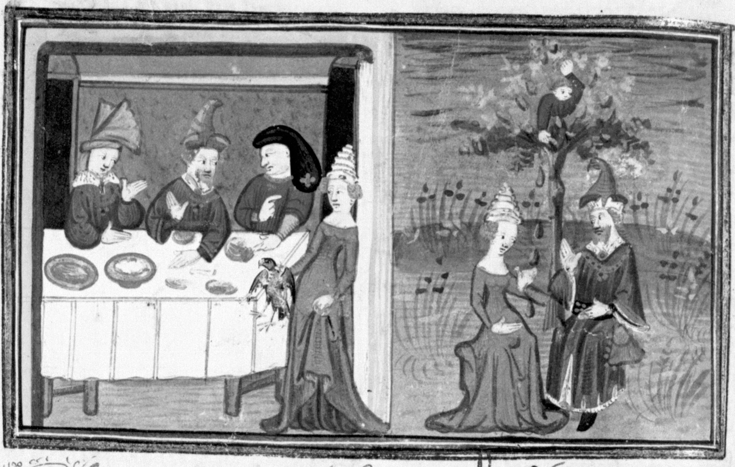 Parigi, Bibliothèque Nationale de France, Fr. 12421, f. 310v. Lidia uccide lo sparviero di suo marito Nicostrato durante un banchetto; Lidia e Nicostrato conversano seduti in un prato, mentre Pirro è nascosto tra i rami di un pero.