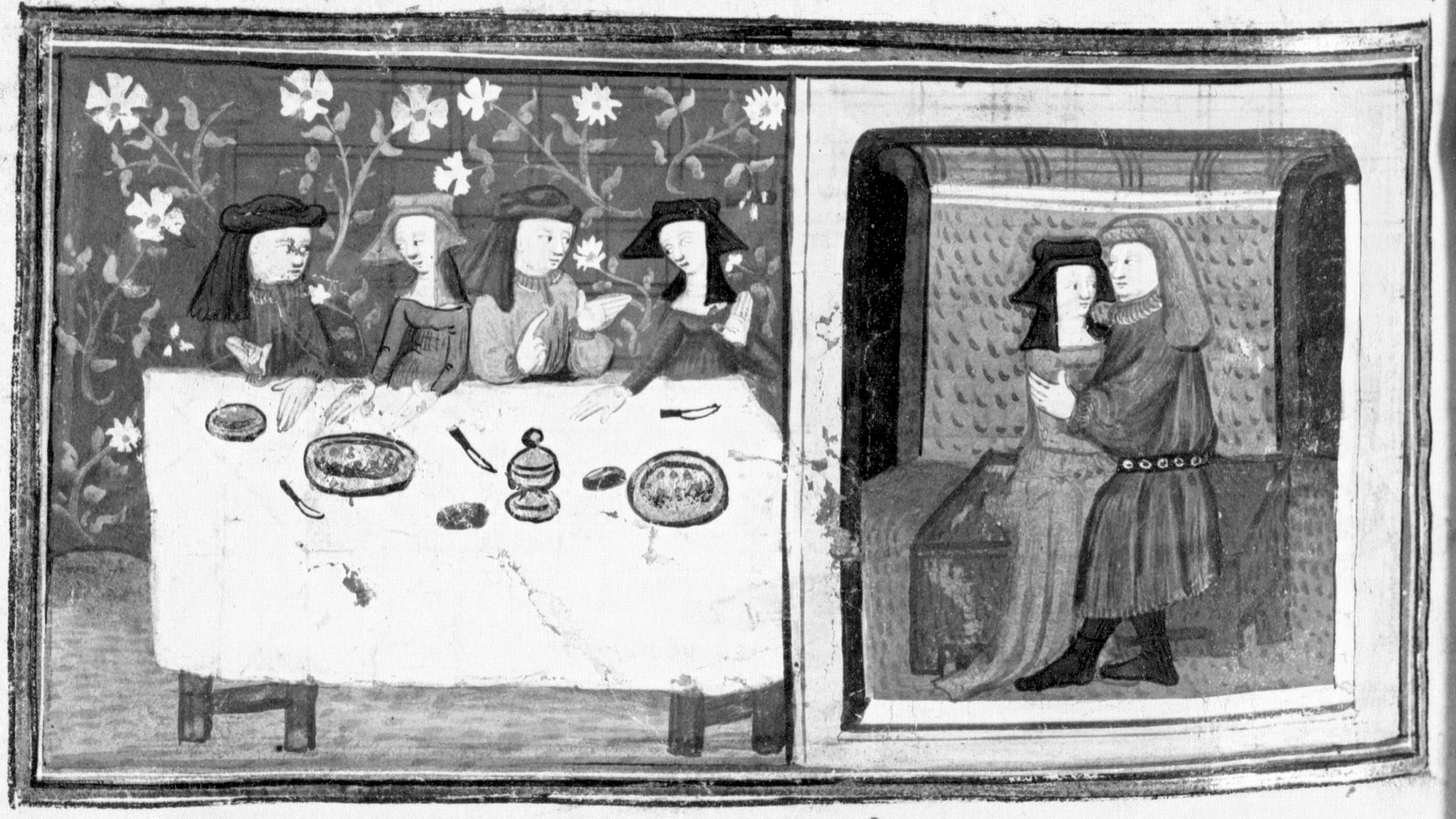 Miniatore francese (1425-1450), Spinelloccio e Zeppa siedono a tavola con le loro mogli; Zeppa si bacia con la moglie di Spinelloccio