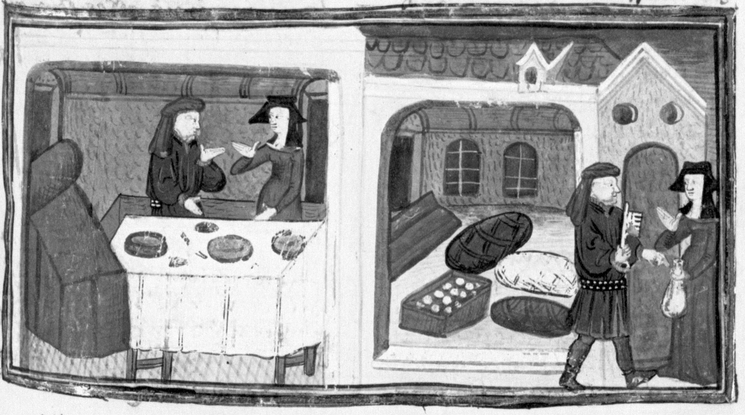 Parigi, Bibliothèque Nationale de France, Fr. 12421, f. 364r. Salabaetto siede a tavola con Iancofiore; Salabaetto si fa consegnare la chiave del magazzino per poterla custodire.