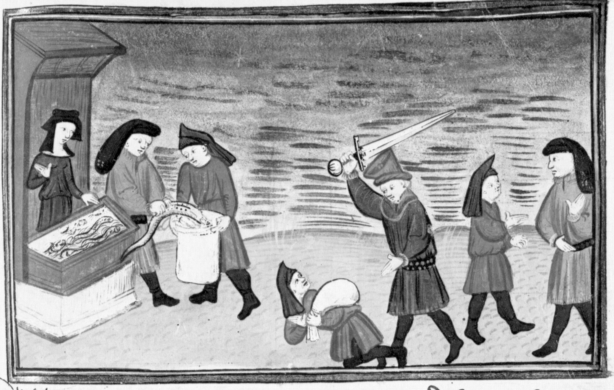 Parigi, Bibliothèque Nationale de France, Fr. 12421, f. 395r. Biondello mostra a Ciacco le lamprede che ha acquistato al mercato; messer Filippo aggredisce Biondello; Ciacco e Biondello si riappacificano.