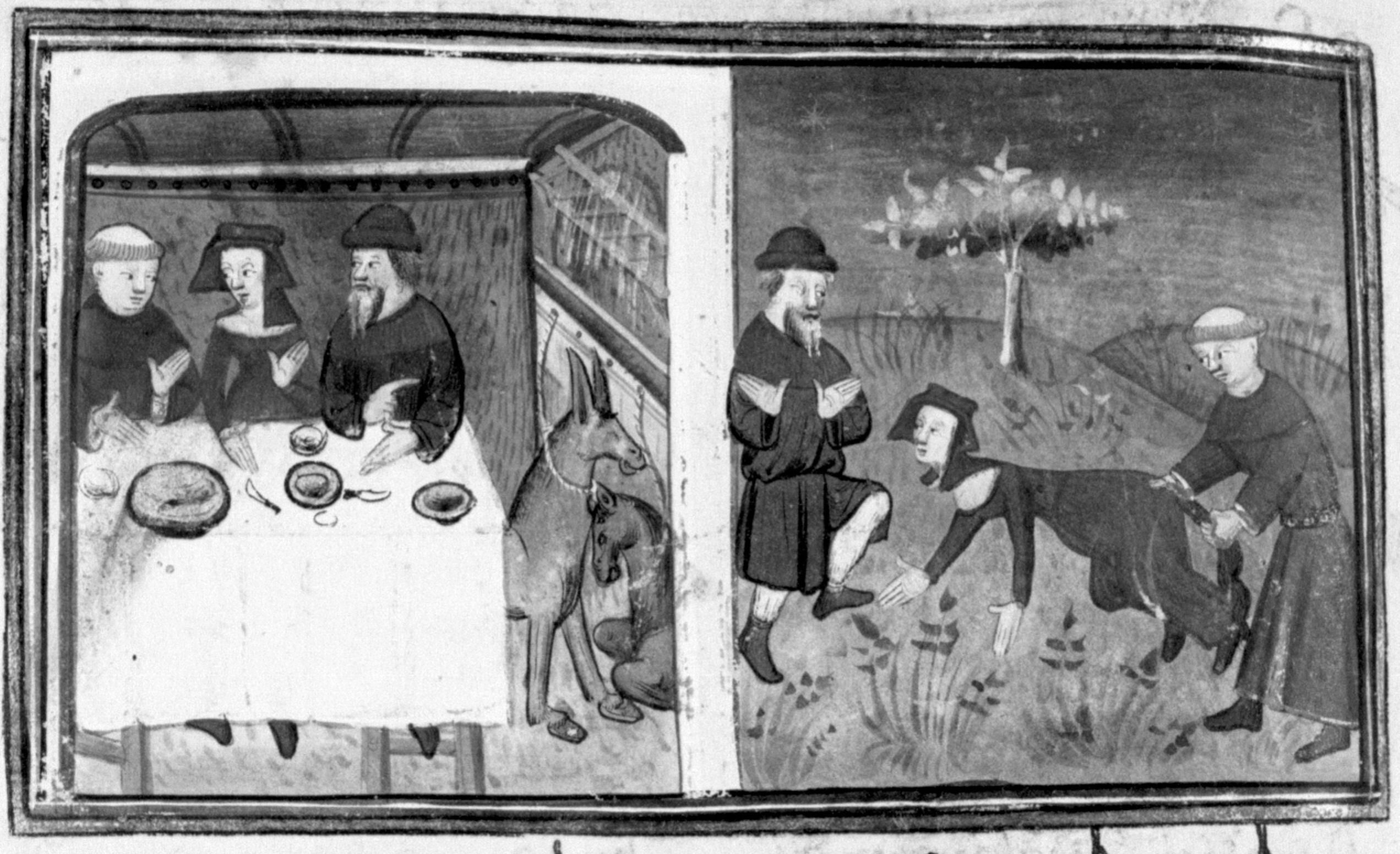 Parigi, Bibliothèque Nationale de France, Fr. 12421, f. 402v. Donno Gianni di Barolo siede a tavola con Pietro da Tresanti e sua moglie; Pietro interrompe donno Gianni mentre questi tenta di attaccare la coda di cavallo alla donna.