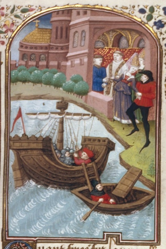 Cambridge (Mass.), Harvard University, Houghton Library, Richardson 31, f. 152v. Un uomo rapisce una donna durante le sue nozze e la conduce verso una nave (?).