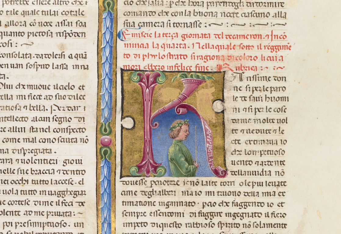 Oxford, Bodleian Library, Holkham misc. 49, f. 64v. Busto di Filostrato, re della quarta giornata, all'interno dell'iniziale figurata K(arissime).