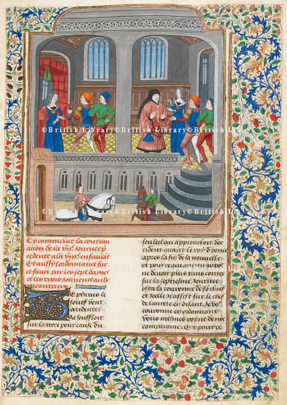 Londra, British Library, Add. 35323, f. 67r. Gulfardo, in presenza di un testimone, restituisce i 200 fiorini presi in prestito ad Ambrogia; in seguito Gulfardo rivela a Guasparruolo di aver consegnato il denaro a sua moglie, la quale conferma la sua storia.