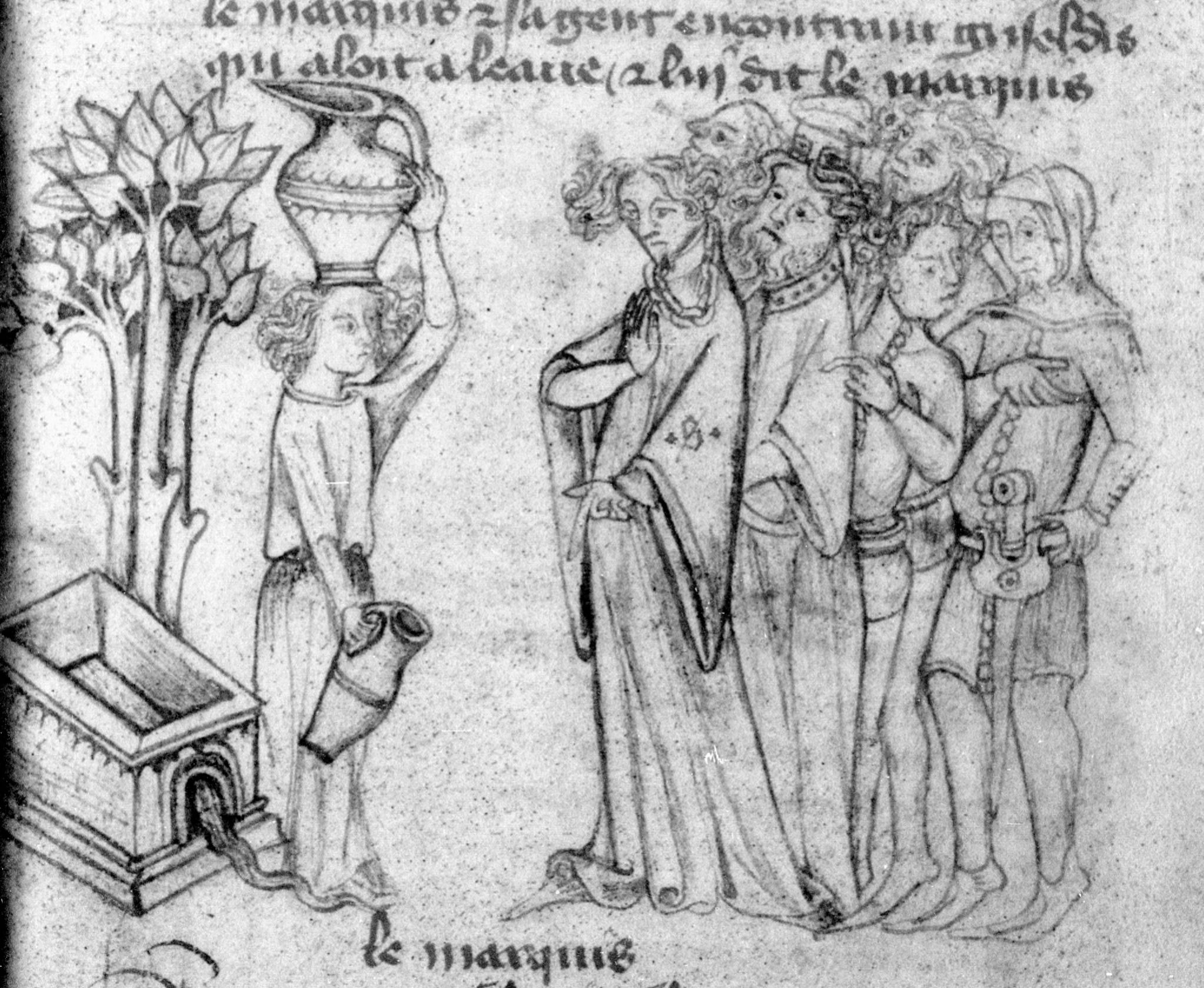 Parigi, Bibliothèque Nationale de France, Fr. 2203, f. 20r. Il manoscritto è datato 1395. Gualtieri, accompagnato dai suoi cortigiani, incontra Griselda di ritorno dalla fonte.