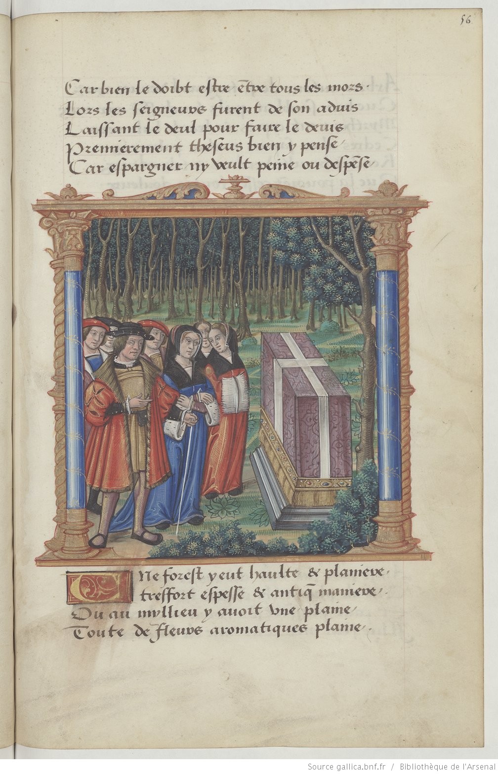 Parigi, Bibliothèque de l'Arsenal, 5116, f. 56r. Teseo, Emilia ed il resto della corte prendono parte al funerale di Arcita nel bosco.