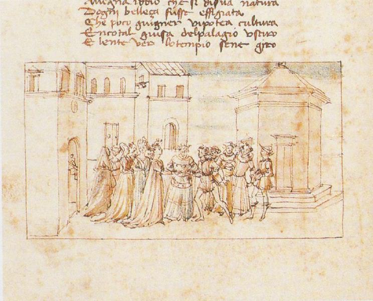 Firenze, Biblioteca Nazionale Centrale, II.II.27, f. 127v. Teseo celebra le nozze tra Emilia e Palemone.