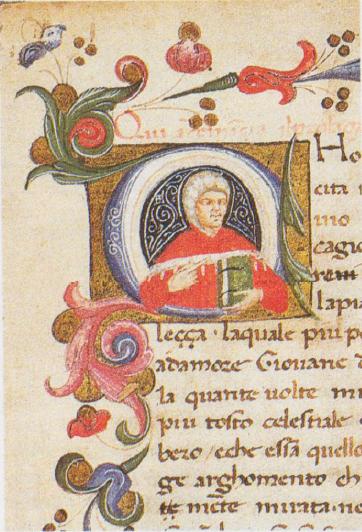 Venezia, Biblioteca della Fondazione Querini Stampalia, VI.2, f. 1r. Busto dell'autore Giovanni Boccaccio con una veste rossa ed un libro tra le mani, all'interno dell'iniziale figurata C(home).