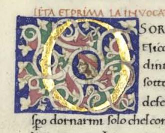 Madrid, Biblioteca Nacional de España, MSS/10271, f. 2v. Piccola testa di profilo di un giovane uomo (Teseo?), all'interno dell'iniziale a bianchi girari e figurata O (sorelle).
