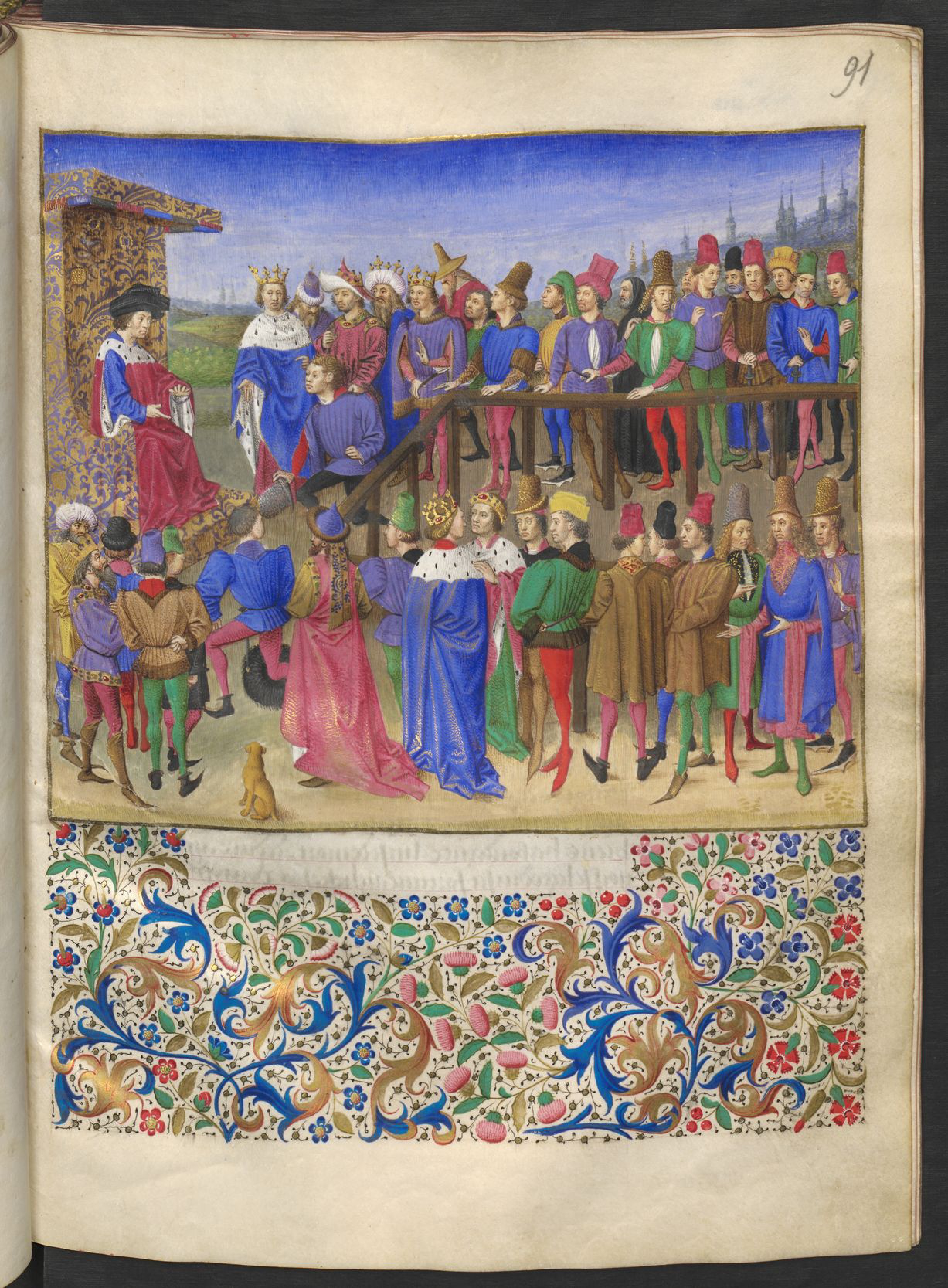 Vienna, Österreichische Nationalbibliothek, 2617, f. 91r. Teseo dispone che Arcita e Palemone, inginocchiati al suo cospetto, si diano battaglia con i loro cavalieri per la mano di Emilia; i principi si radunano ad Atene presso il teatro della reggia per assistere al duello.