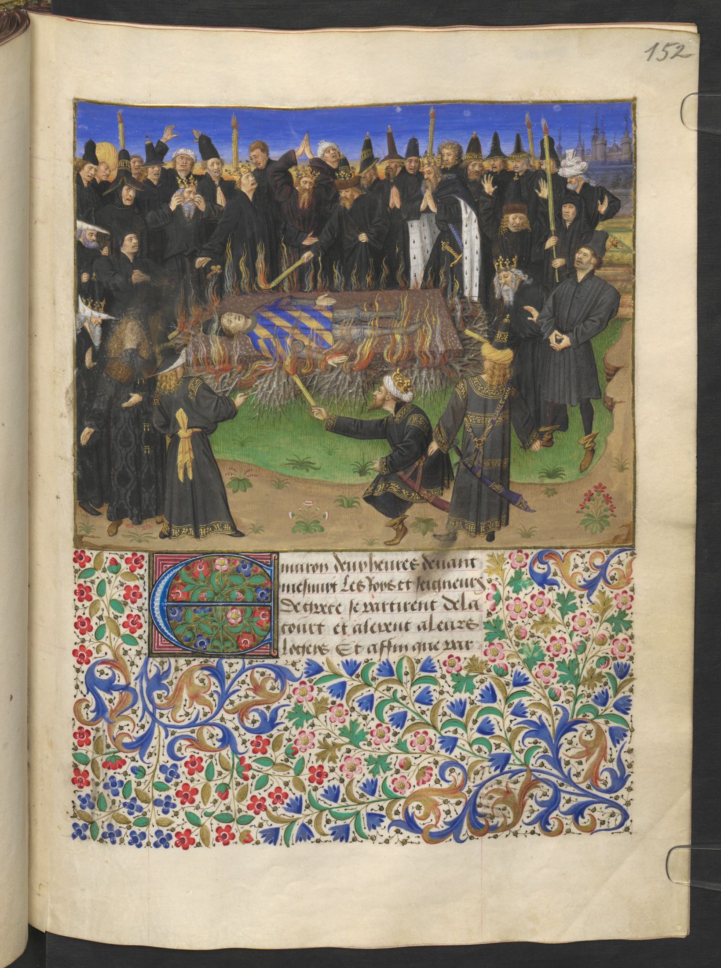 Vienna, Österreichische Nationalbibliothek, 2617, f. 152r. Una folla assiste al rogo funebre di un guerriero greco (potrebbe trattarsi del funerale di Arcita, che tuttavia è descritto nel libro XI).