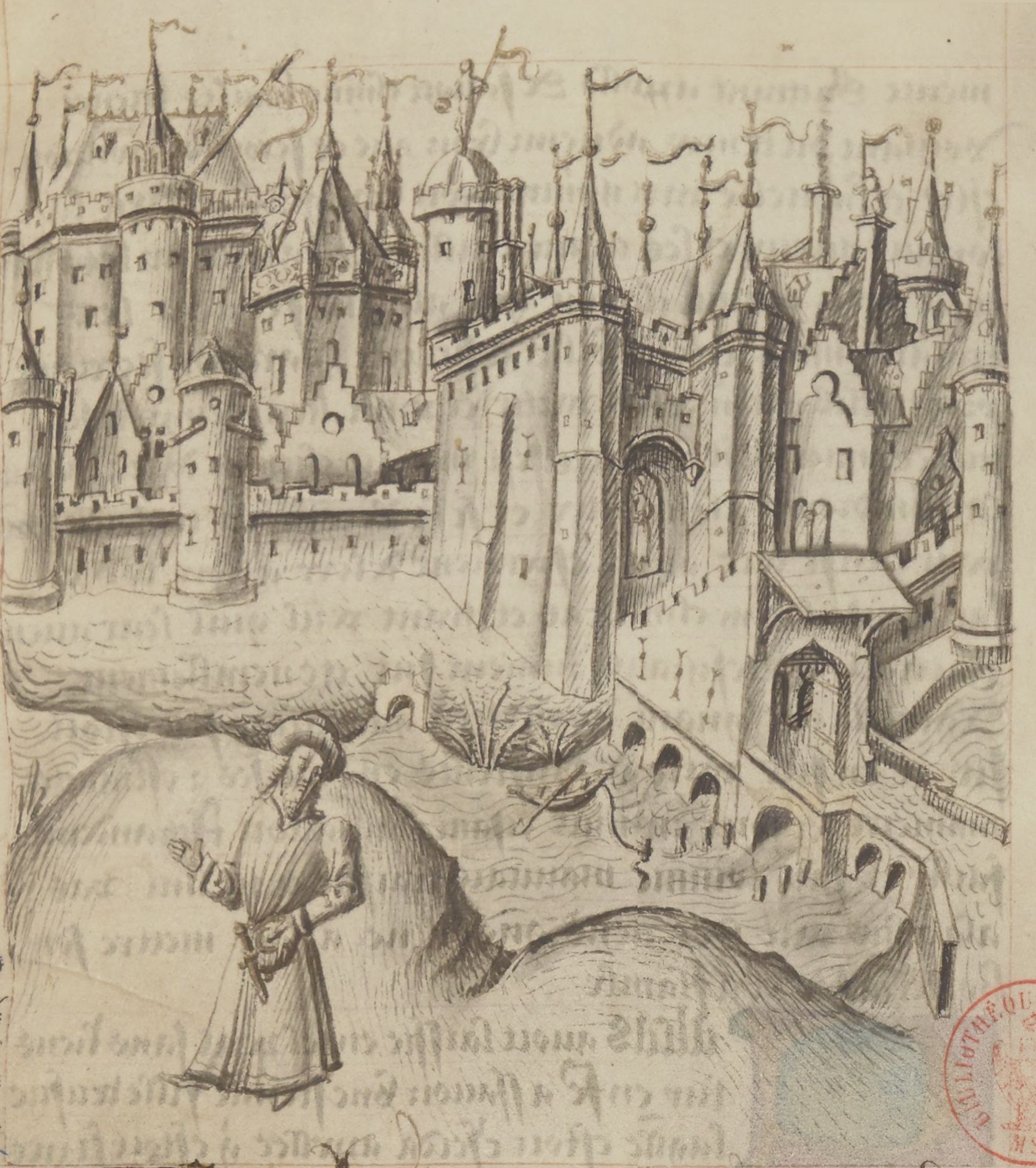 Parigi, Bibliothèque Nationale de France, Fr. 25528, f. 3r. Il copista del manoscritto è Pierre d'Amboise. Il veggente Calcante fugge da Troia dopo averne predetto la caduta.