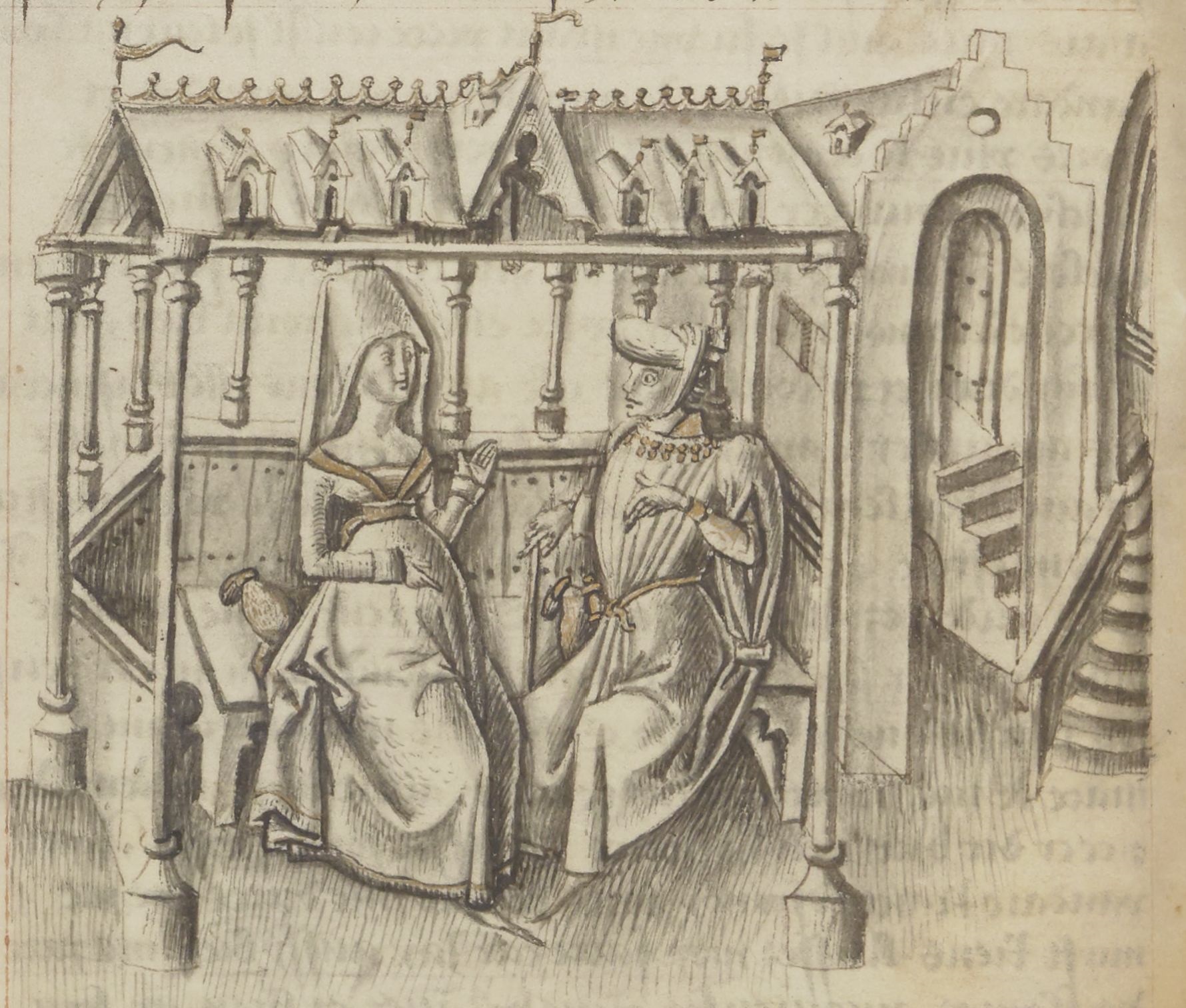 Parigi, Bibliothèque Nationale de France, Fr. 25528, f. 13v. Il copista del manoscritto è Pierre d'Amboise. Pandaro si reca da Criseide per corteggiare la fanciulla al posto dell'amico.