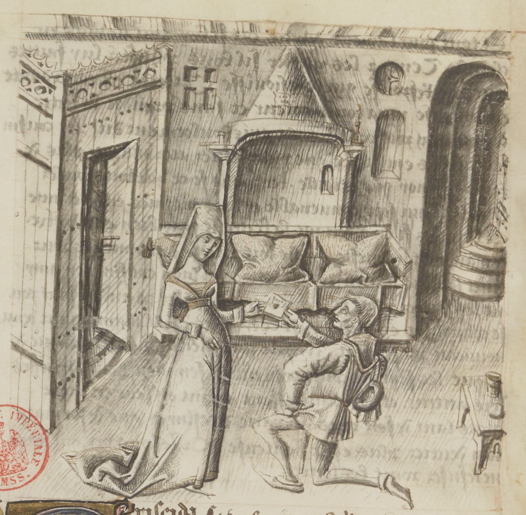 Parigi, Bibliothèque Nationale de France, Fr. 25528, f. 23v. Il copista del manoscritto è Pierre d'Amboise. Pandaro, inginocchiato, consegna a Criseide la lettera di Troiolo.