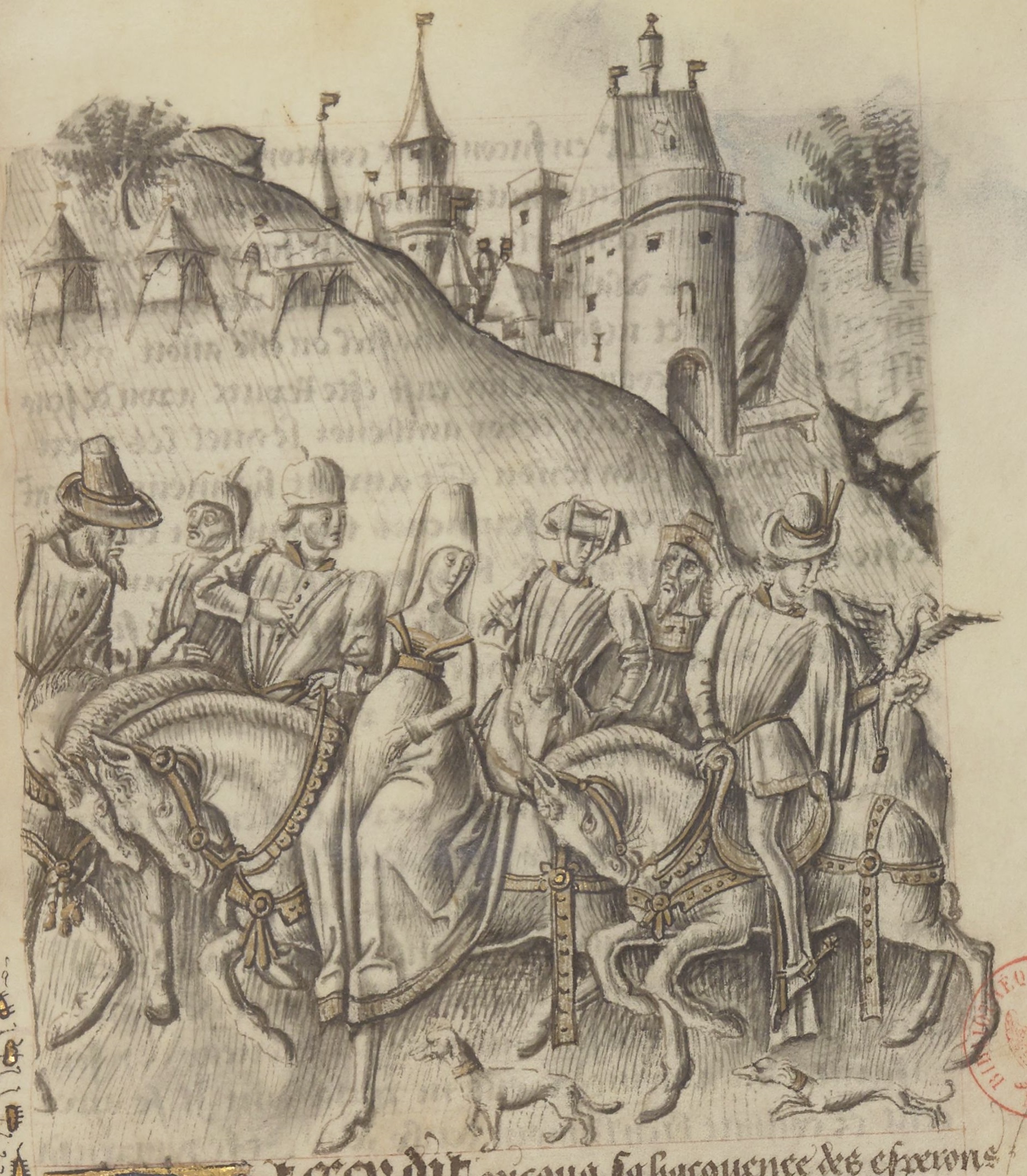 Parigi, Bibliothèque Nationale de France, Fr. 25528, f. 63r. Il copista del manoscritto è Pierre d'Amboise. Criseide viene ricondotta all'accampamento greco in compagnia di una scorta a cavallo, tra cui è presente Troiolo con un falcone sul pugno.