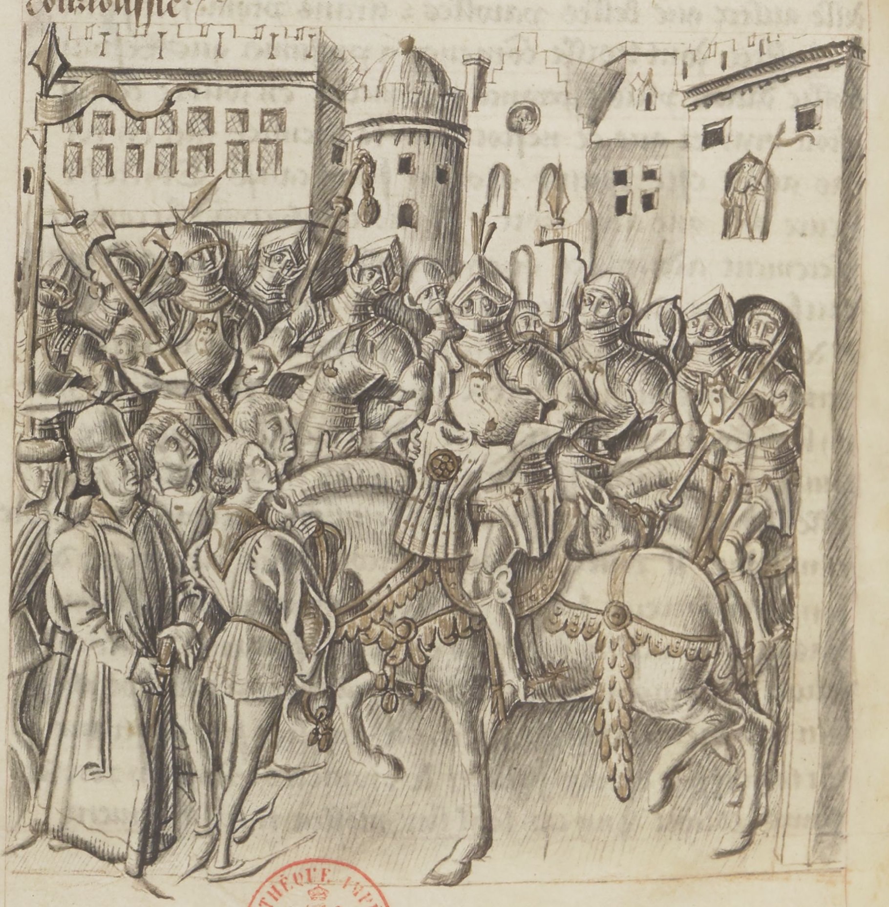Parigi, Bibliothèque Nationale de France, Fr. 25528, f. 89v. Il copista del manoscritto è Pierre d'Amboise. Una folla accoglie il ritorno di Deifobo, ritornato vittorioso a Troia dopo lo scontro con Diomede e recante come trofeo l'armatura del nemico con il fermaglio d'oro di Criseide.