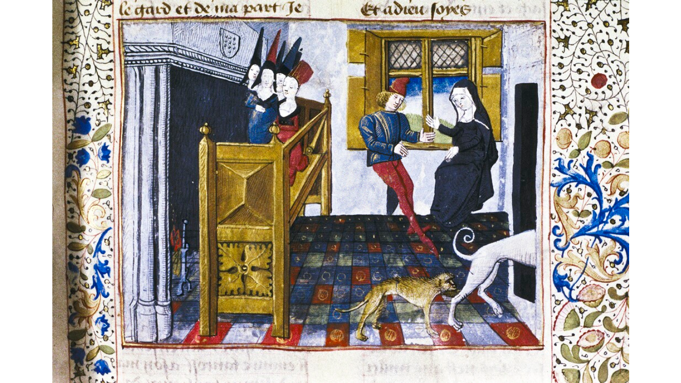 Oxford, Bodleian Library, Douce 331, f. 15r. Pandaro, seduto accanto alla finestra, corteggia Criseide mentre sei dame siedono dinanzi al caminetto.