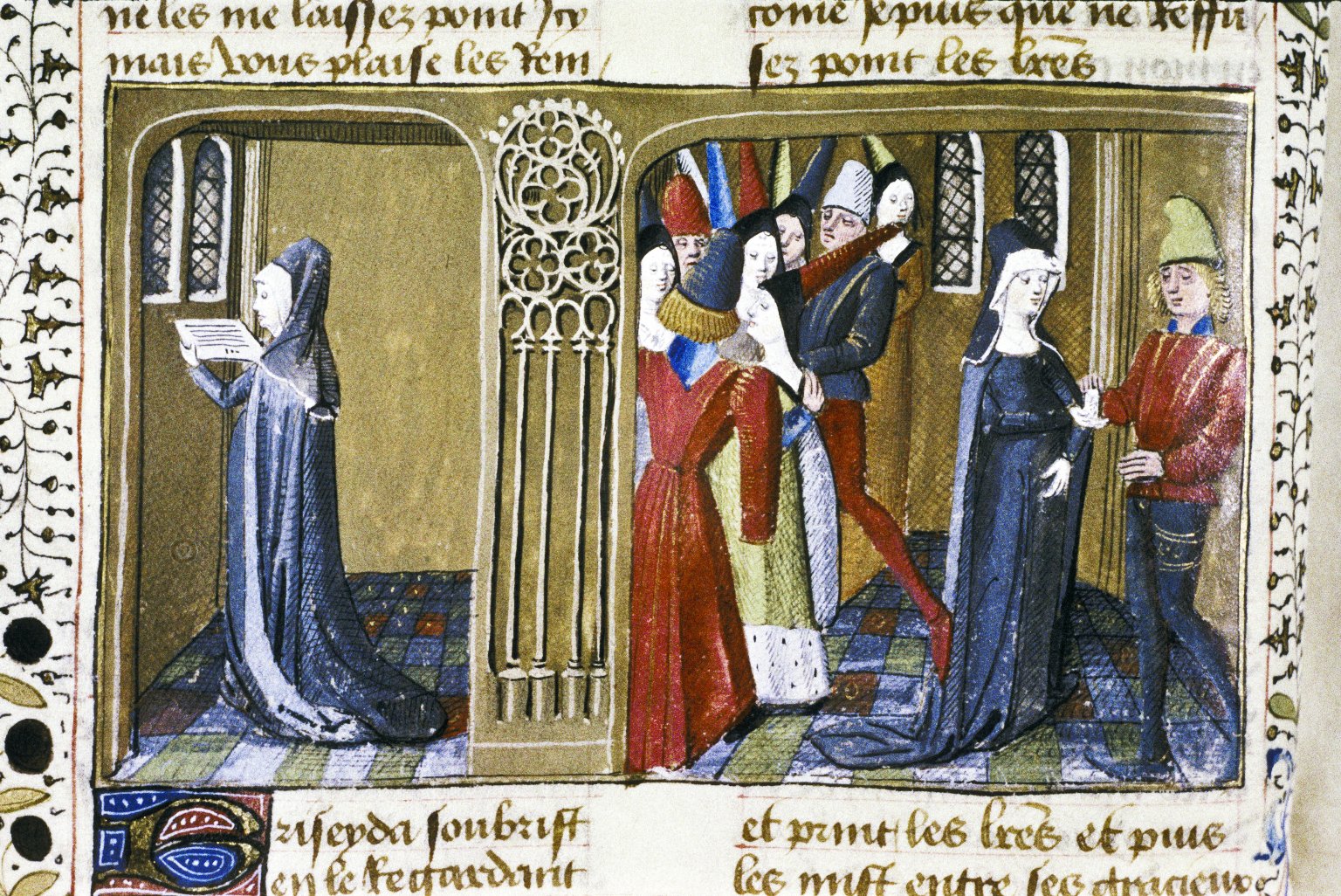 Oxford, Bodleian Library, Douce 331, f. 19v. Sulla destra, Pandaro consegna la missiva di Troiolo a Criseide, lontani dagli altri personaggi; sulla sinistra, Criseide legge la lettera dell'amato.