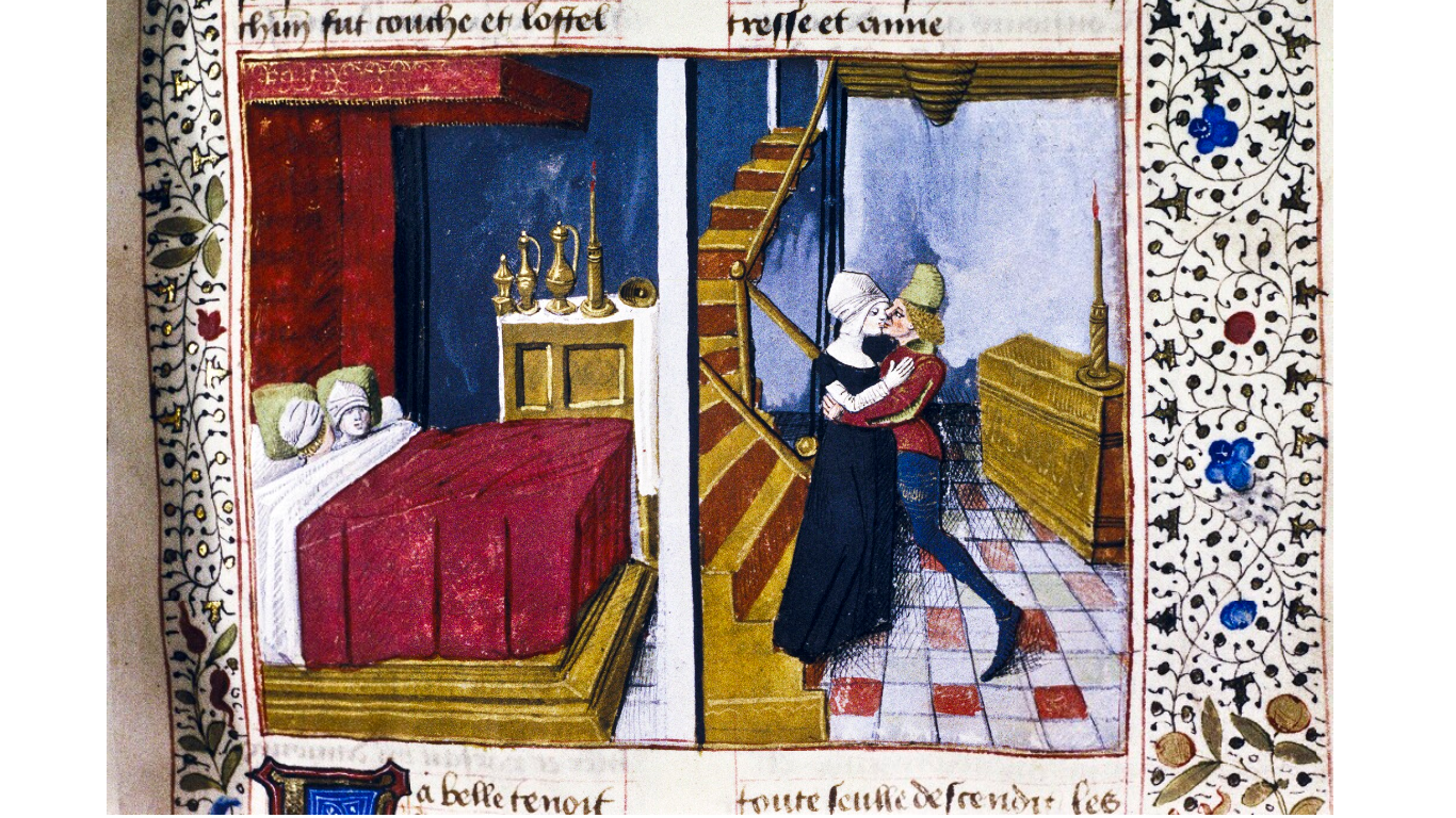 Oxford, Bodleian Library, Douce 331, f. 26r. Sulla destra, Troiolo e Criseide si scambiano un bacio ai piedi della scala; sulla sinistra, i due amanti giacciono insieme nel letto.