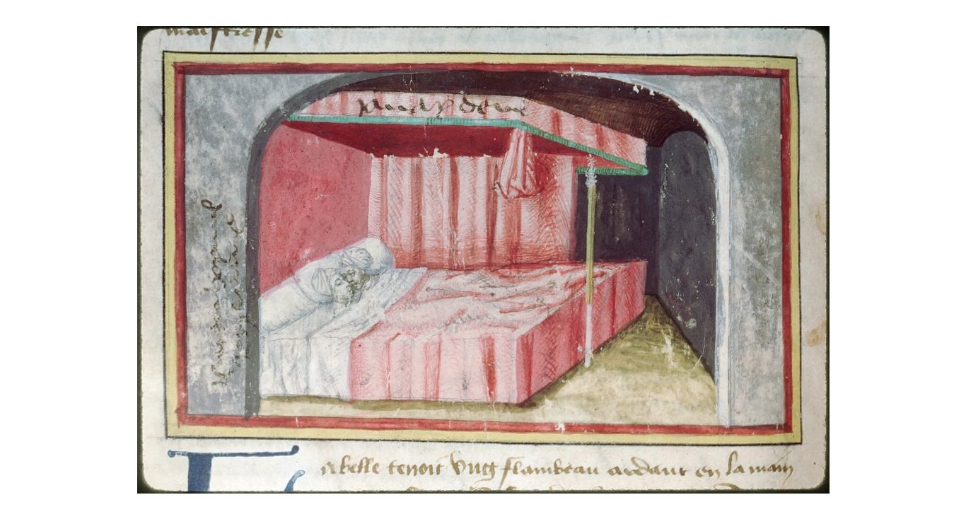 Tours, Bibliothèque Municipale, 0956, f. 23v. Troiolo e Criseide giacciono insieme nel letto.