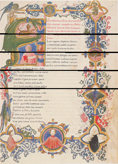 Londra, British Library, Add. 21246, f. 5r. Ritratto dell'autore Giovanni Boccaccio con un libro, all'interno dell'iniziale figurata e zoomorfa A(lcun); nel margine inferiore della pagina sono tre personaggi a mezzobusto all'interno di tre medaglioni.