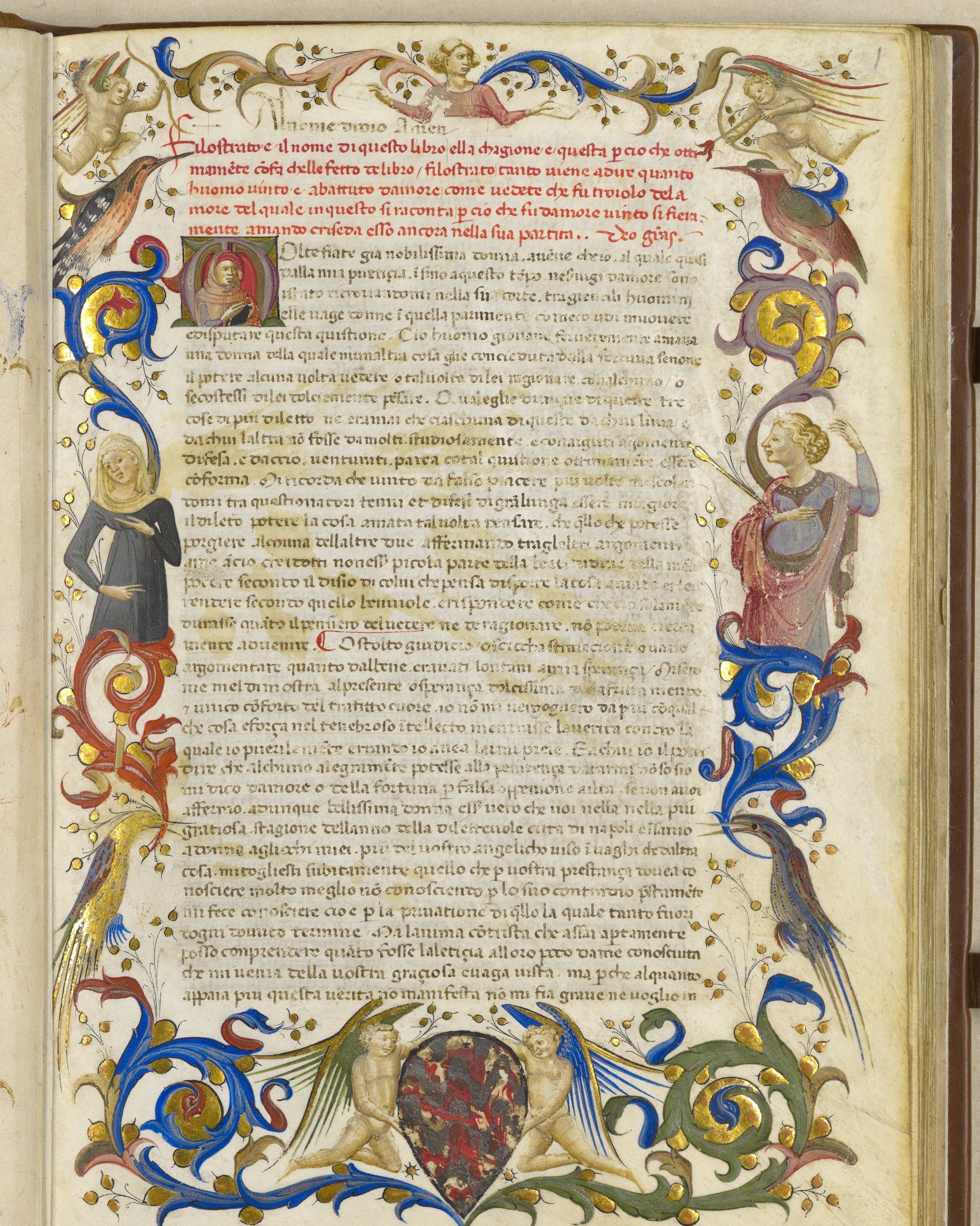 Amburgo, Staats- und Universitätsbibliothek, in scrinio 47b, f. 1r. Ritratto dell'autore Giovanni Boccaccio con un libro all'interno dell'iniziale figurata M(olte); nel fregio marginale sono raffigurati Criseide (margine sinistro), Troiolo colpito dalla freccia di Cupido (margine destro), Pandaro a mezzobusto con le lettere dei due amanti nelle mani (margine superiore).