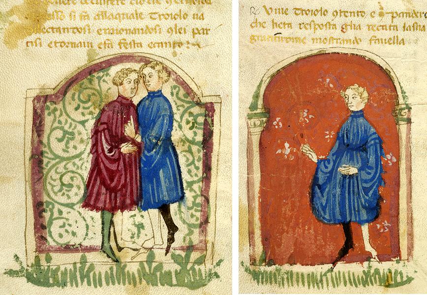 New York, Pierpont Morgan Library, M 371, f. 19v. Il copista del manoscritto, datato ottobre 1414, è Pace di Giuliano da Olibano. Pandaro conferisce con Troiolo; Troiolo si trova da solo.