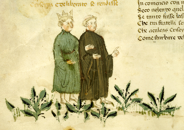 New York, Pierpont Morgan Library, M 371, f. 27v. Il copista del manoscritto, datato ottobre 1414, è Pace di Giuliano da Olibano. Calcante si trova con Antenore, liberato dai Greci.