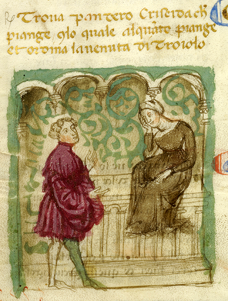 New York, Pierpont Morgan Library, M 371, f. 33v. Il copista del manoscritto, datato ottobre 1414, è Pace di Giuliano da Olibano. Pandaro tenta di consolare Criseide.