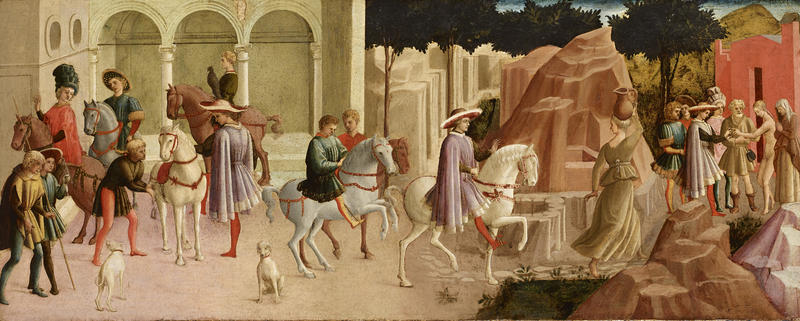 Francesco di Stefano detto Il Pesellino (1445-1450), Gualtieri di Saluzzo si appresta a recarsi presso la casa di Giannucole; Gualtieri incontra Griselda; Gualtieri sposa Griselda