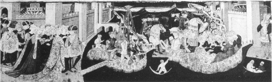 Apollonio di Giovanni (1460-65), Alatiel si imbarca per il suo viaggio; naufragio della nave di Alatiel; Pericone da Visalgo salva le donne e le conduce al suo castello