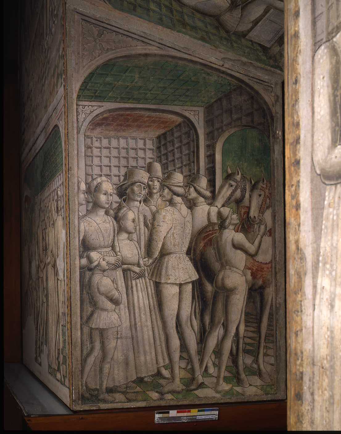 Milano, Pinacoteca del Castello Sforzesco, inv. n. 1347/24. Il conte di Panago si congeda da Griselda e dalla sua famiglia. Affresco strappato proveniente dalla Rocca dei Rossi a Roccabianca (PR).