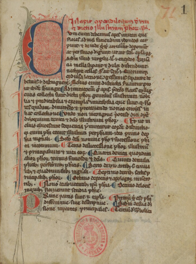 Membr., cc. II + 81, mm. 160 × 120, secc. XIII/XIV. Giovanni Gallico, "Compendiloquium de vita et dictis illustrium philosophorum". Segnatura della parva libraria: III 15. Di mano del B. solo il notabile «Aristoteles» (c. 63r), forse da assegnare alla fine degli anni ’60.