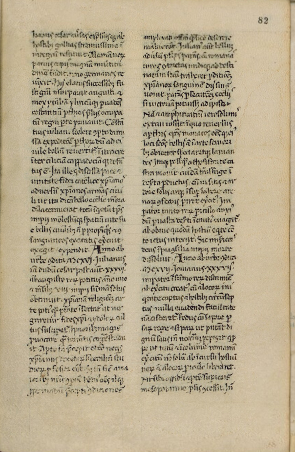 Membr., cc. II + 28 (sec. XII) + 73 + I (sec. XIV), mm. 214 × 145. P. Orosius, "Historiae adversus paganos"; Paolo Diacono, "Additamentum ad Eutropii Breviarium ab Urbe condita". Segnatura della parva libraria: II 7. Di mano del B. le cc. 29r-102v, trascritte nei primi anni ’50. Cadute nel corpo del cod. diverse cc., attualmente conservate nell’Harley 5383 e nel Riccardiano 2795 [ALI 1851 e 1849]. In margine alla sezione di mano del B., rare postille e correzioni di mani coeve.